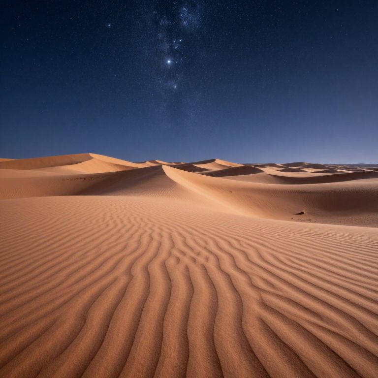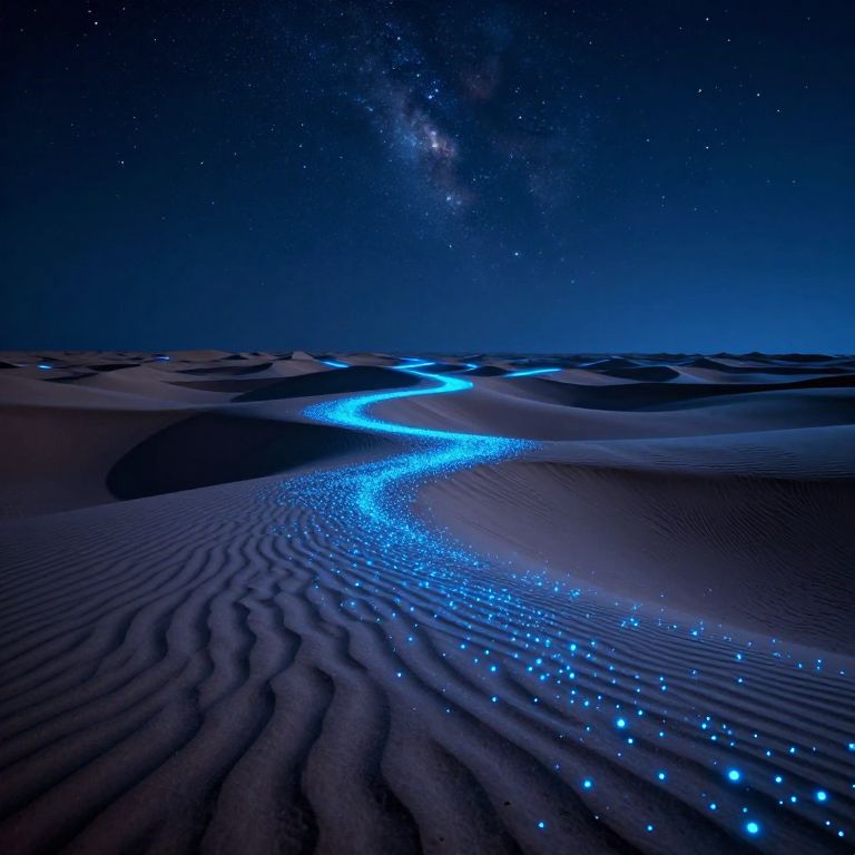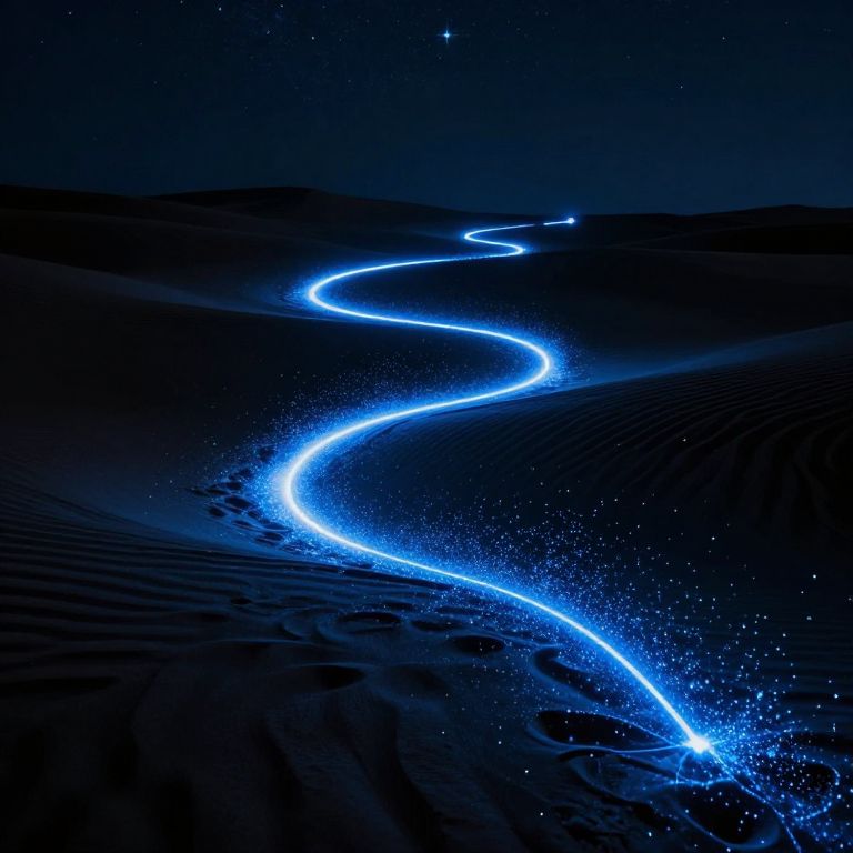Twinkling particles cascade down a golden path through undulating sand dunes under a starlit sky, creating a shimmering, ephemeral cityscape of light that stretches toward the horizon.
