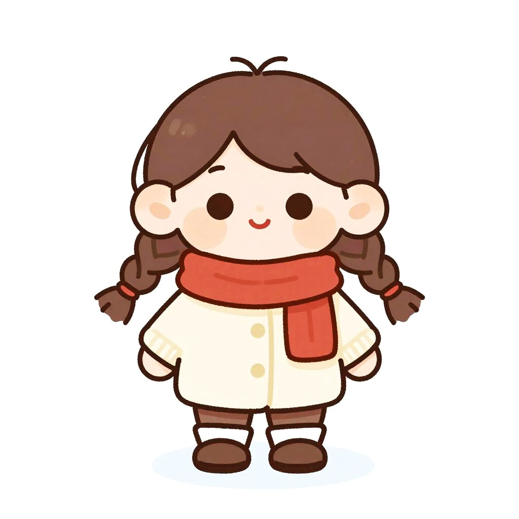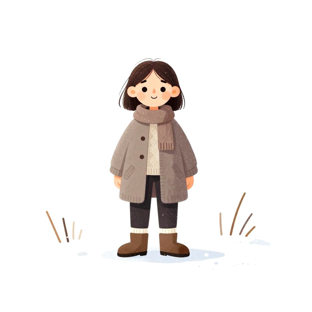 Illustration character design, cartoonish whimsical style. Girl in snow, bright colors, soft smooth shapes, yellow puffer vest over red sweater, Indian folk, playful mood, snowy playground environment, white backdrop