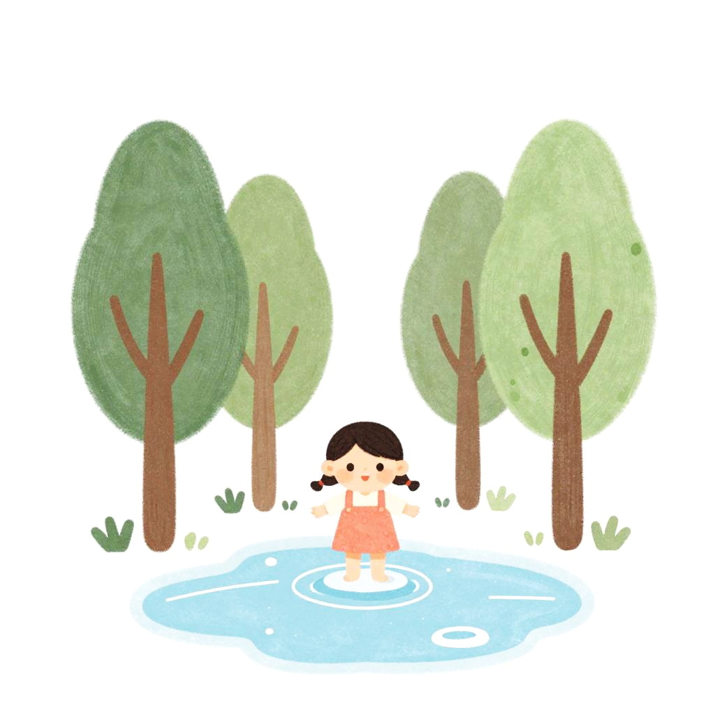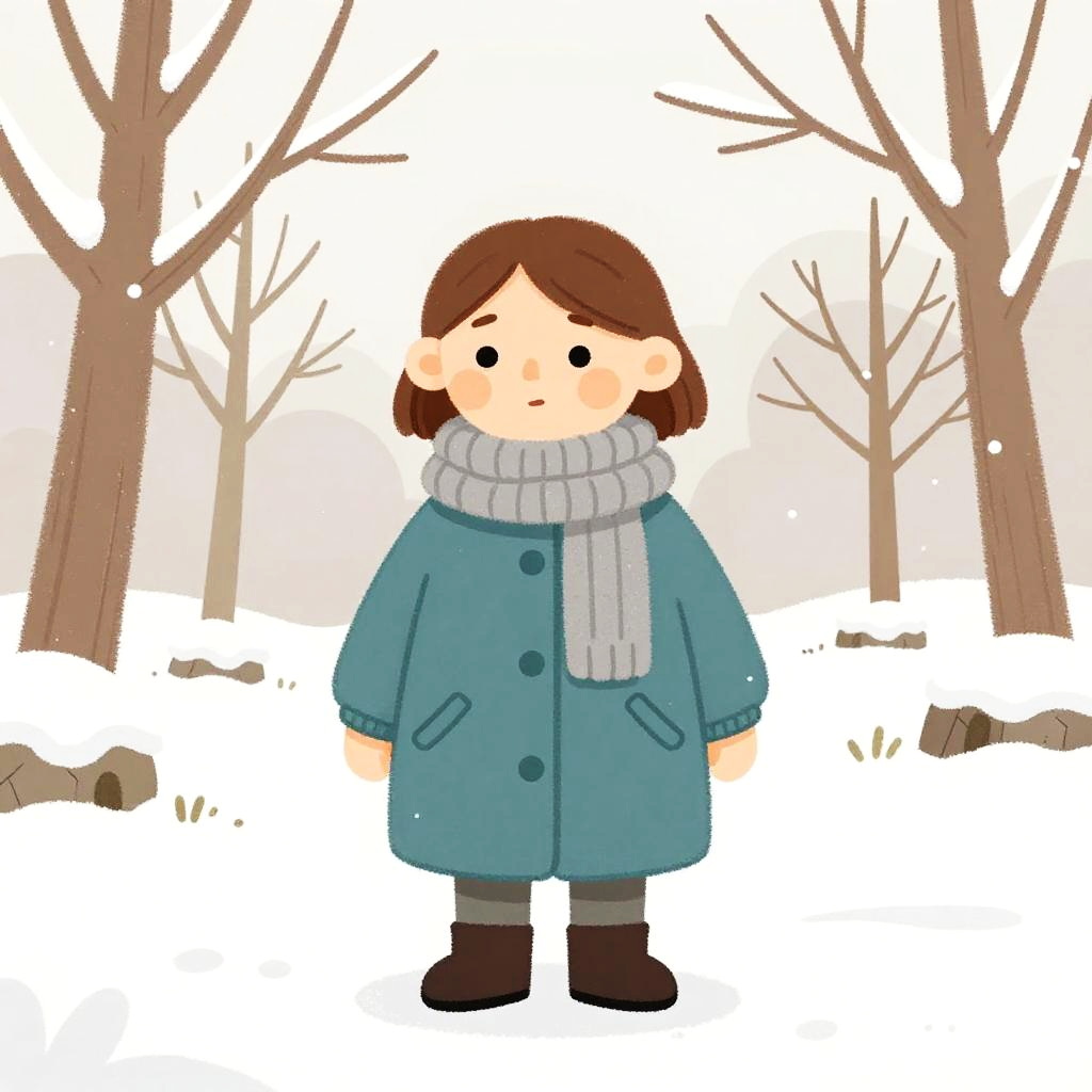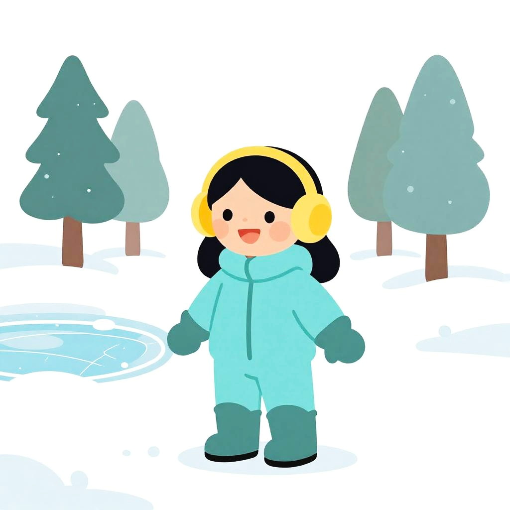 Illustration of a cheerful cartoon girl with dark braided hair wearing a bright yellow puffer vest over a red Indian folk sweater. She stands in a snowy playground environment with colorful slides and snow-covered pine trees in the background. The scene features soft, smooth shapes and vivid colors creating a playful, whimsical mood.