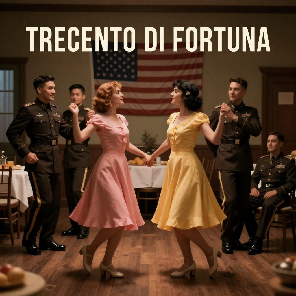 Movie poster of "Trecento di Fortuna". Five people dancing in a dimly lit room. Two women in pink and yellow dresses, three men in dark military uniforms. Background: American flag, tables with food, wooden floor. Women looking up at men, men smiling. Two women in center, men on left and right. One man sitting on right. Warm, nostalgic colors.