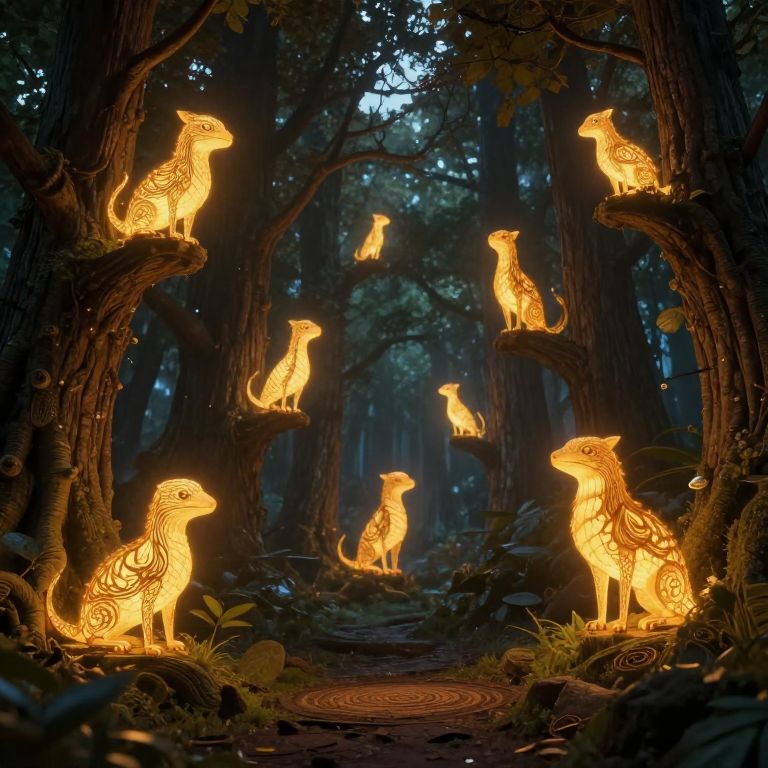 Photograph of a luminous forest scene featuring glowing, intricately patterned animal lanterns perched on trees, casting a warm, enchanting light