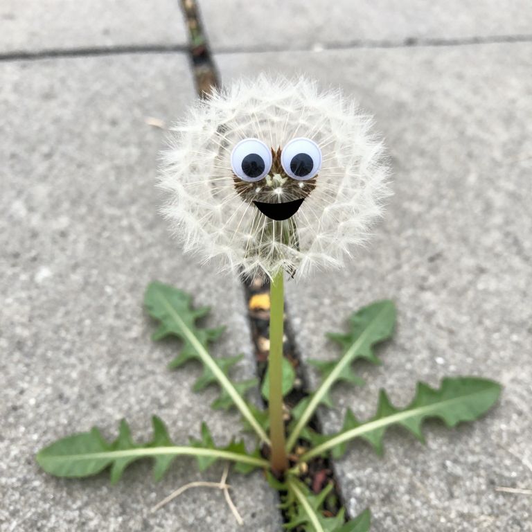 Close up shot of a dandelion plant growing in a crack of a concrete pavement, the dandelion has a single mature flower, the flower has googly eyes and a cartoonish happy mouth, the eyes and mouth on the flower make for a derpy face, the image conveys the immortality and resilience of a funny but a little stupid happy go lucky plant that the dandelion is