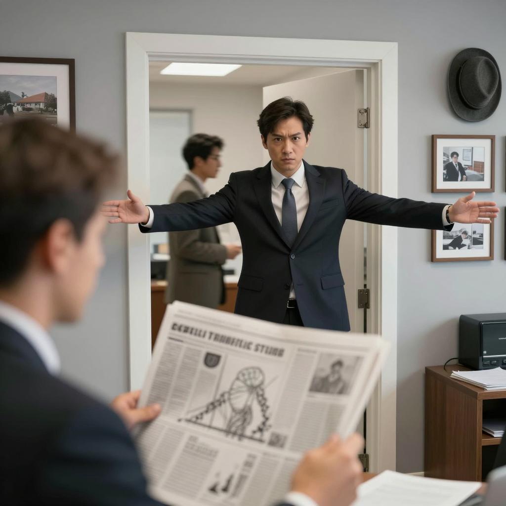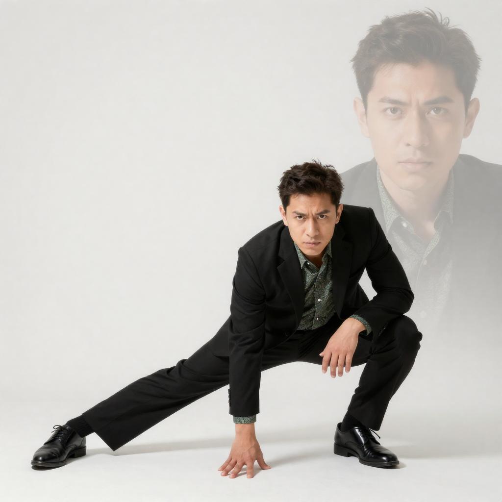 Photograph of an Asian man wearing a black suit with a green patterned shirt and black dress shoes. He is in a crouching position performing a long, low stretch with his left hand touching the ground. The background is plain white with a faint translucent overlay of his intense facial expression on the right side.