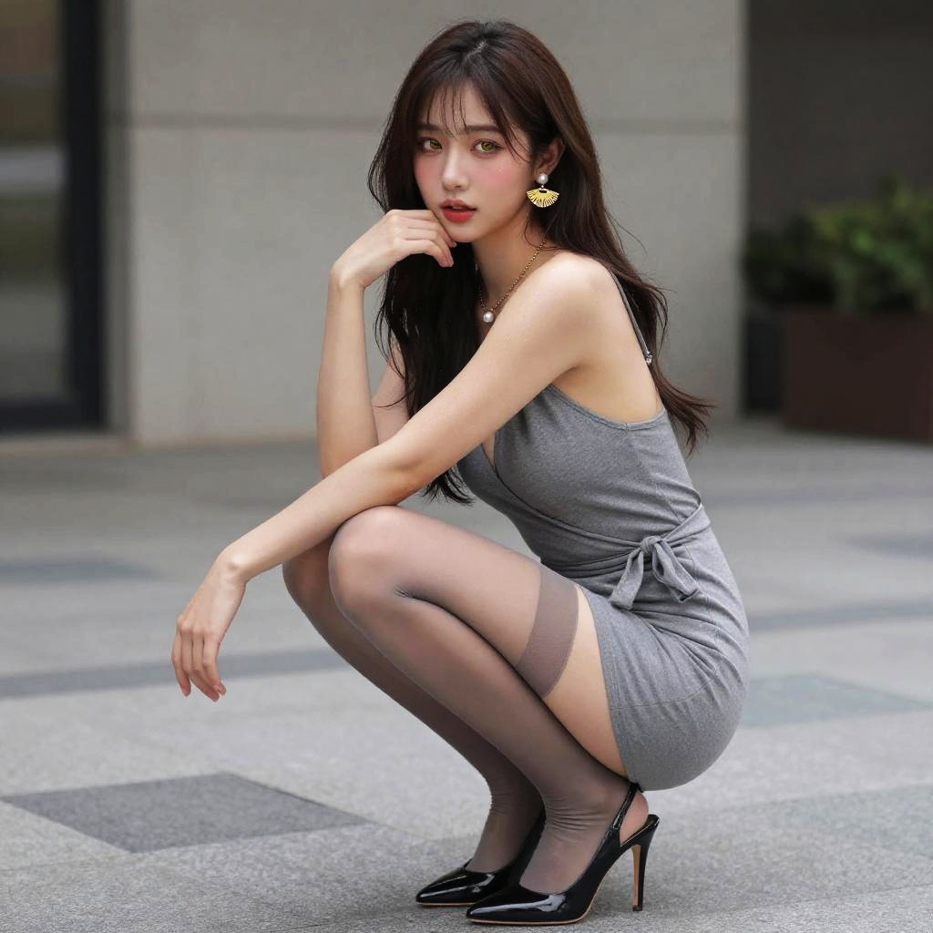 (8k, best quality, masterpiece, ultra highres:1.2), 1 girl hotsquat, beautiful 22 year old woman named Tsukiko wearing wrap dress, pearl earrings, and slingback pumps squatting posing for full body photoshoot, stockings, thigh-highs, high heels, coreset, parted lips, colored inner hair, The Side Shave, gold eyes, fan earrings, gold necklace, outdoors, noon, intricately detailed face and eyes, cute face, blush, glistening sweaty skin, dynamic pose, official art, extremely detailed CG unity 8k wallpaper, ultra high res, professional photography, sharp focus, HDR, 8K resolution, intricate detail, sophisticated detail, depth of field, analogue RAW DSLR, photorealistic