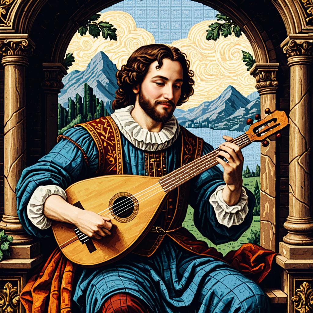 Time Machine draw an wandering bard, in the style of renaissance painting combined with pixel art, dithering and no anti-aliasing, resembling a joyful minstrel with a lute, clear pixel art, retro aesthetic.