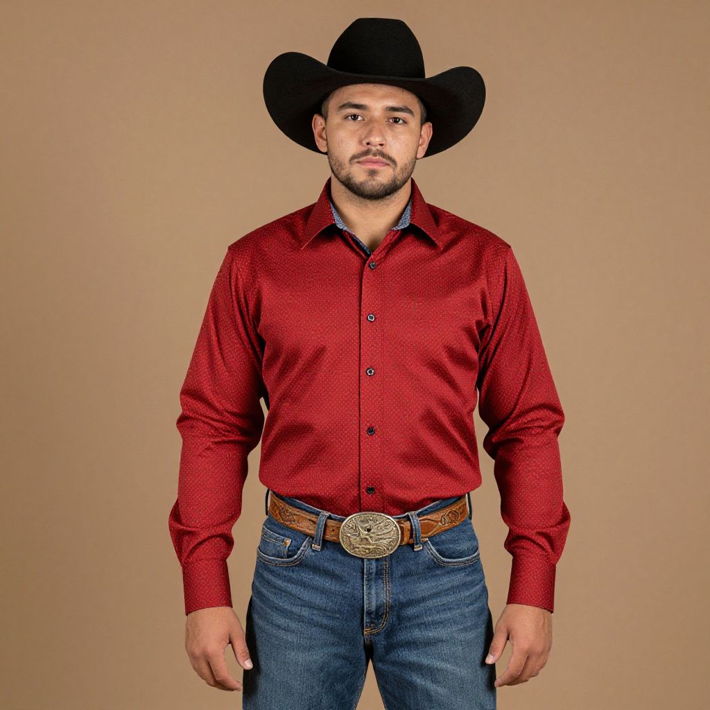 Photograph of a young man standing against a wooden wall. He's wearing a black cowboy hat, light blue striped shirt, and dark blue jeans with a brown belt that has a large, ornate silver buckle. His hands rest casually in his pockets, and he looks directly at the camera with a neutral expression. The wooden wall in the background has a brown, textured finish.