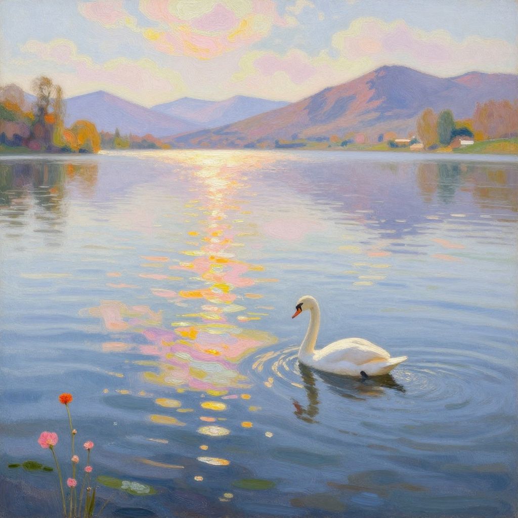 Oil painting: Two white swans in foreground, three sailboats with white sails on calm lake, white houses with red roofs in background, blue sky