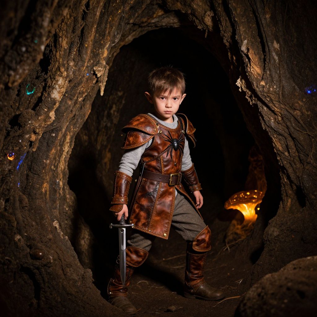 Photograph of a young boy with fair skin and short brown hair, standing in a dimly lit, rugged cave. He wears a brown leather armor vest over a white long-sleeve shirt, gray pants, and brown boots. He holds a small sword in his right hand. The cave's dark, rocky walls frame him, with a faint, glowing orange light in the background. The boy's serious expression and determined stance evoke a sense of adventure and bravery. The image has a dramatic, fantasy-like quality, enhanced by the contrast between the dark cave and the boy's illuminated figure.