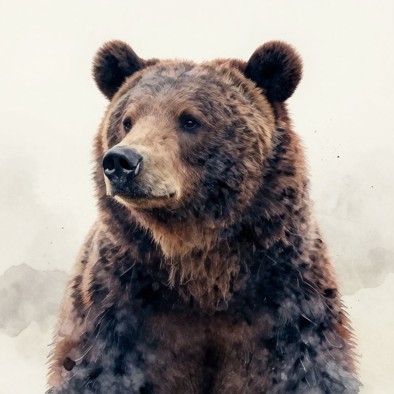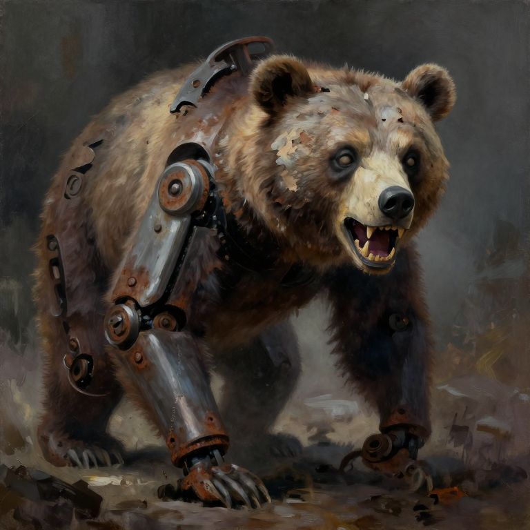 Oil painting of A decaying animatronic bear with patches of fur missing and exposed, rusted metal joints, Its eyes are dull and lifeless, and its mouth hangs open, revealing broken, jagged teeth, The once cheerful paint on its face is chipped and faded, giving it a sinister, menacing look, It moves with a jerky, mechanical motion, emitting a low, grinding noise, visible brushstrokes, atmospheric haze, low key, moody lighting, watercolors