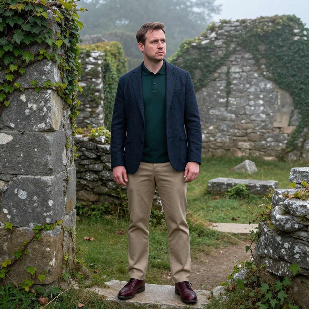A man, dark green polo shirt, navy tweed blazer, khaki dress pants, burgundy leather brogues, ancient stone ruins, overgrown with ivy, misty morning light, cinecolor, contemplative expression. Man has masculine face and piercing eyes