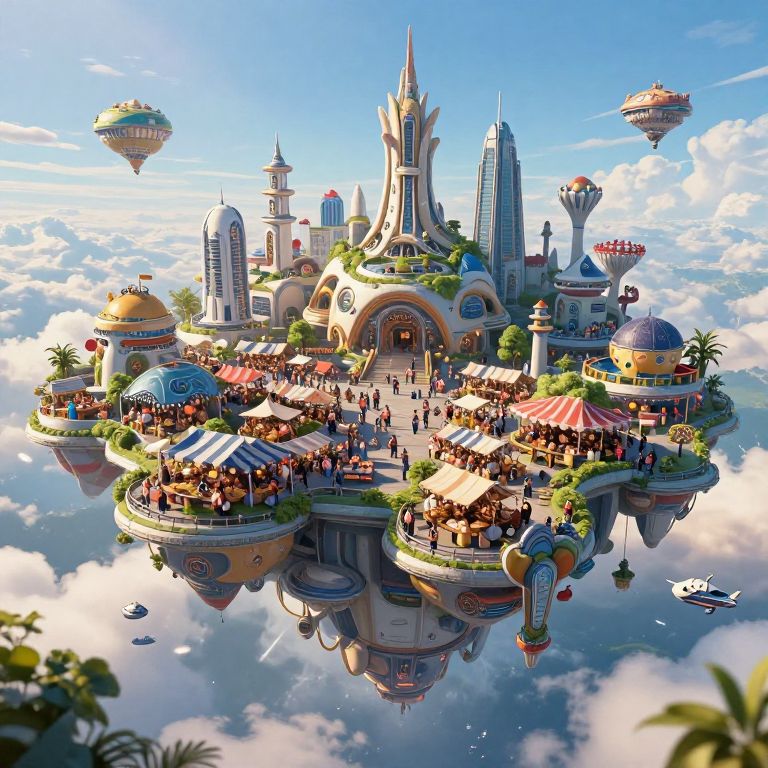 Floatingcityx portrayed as a vibrant trade hub in the sky, bustling markets on floating platforms, diverse futuristic architecture blending organic and mechanical elements, bright daylight with detailed clouds and flying ships in a lively atmosphere