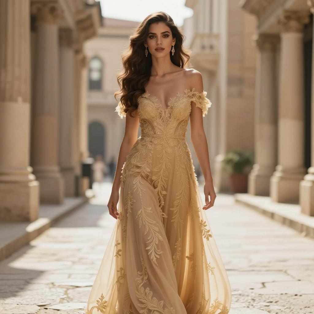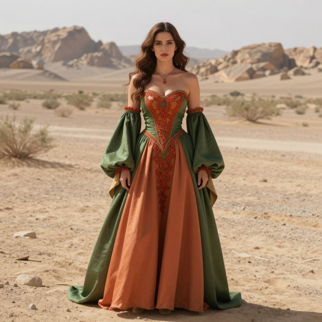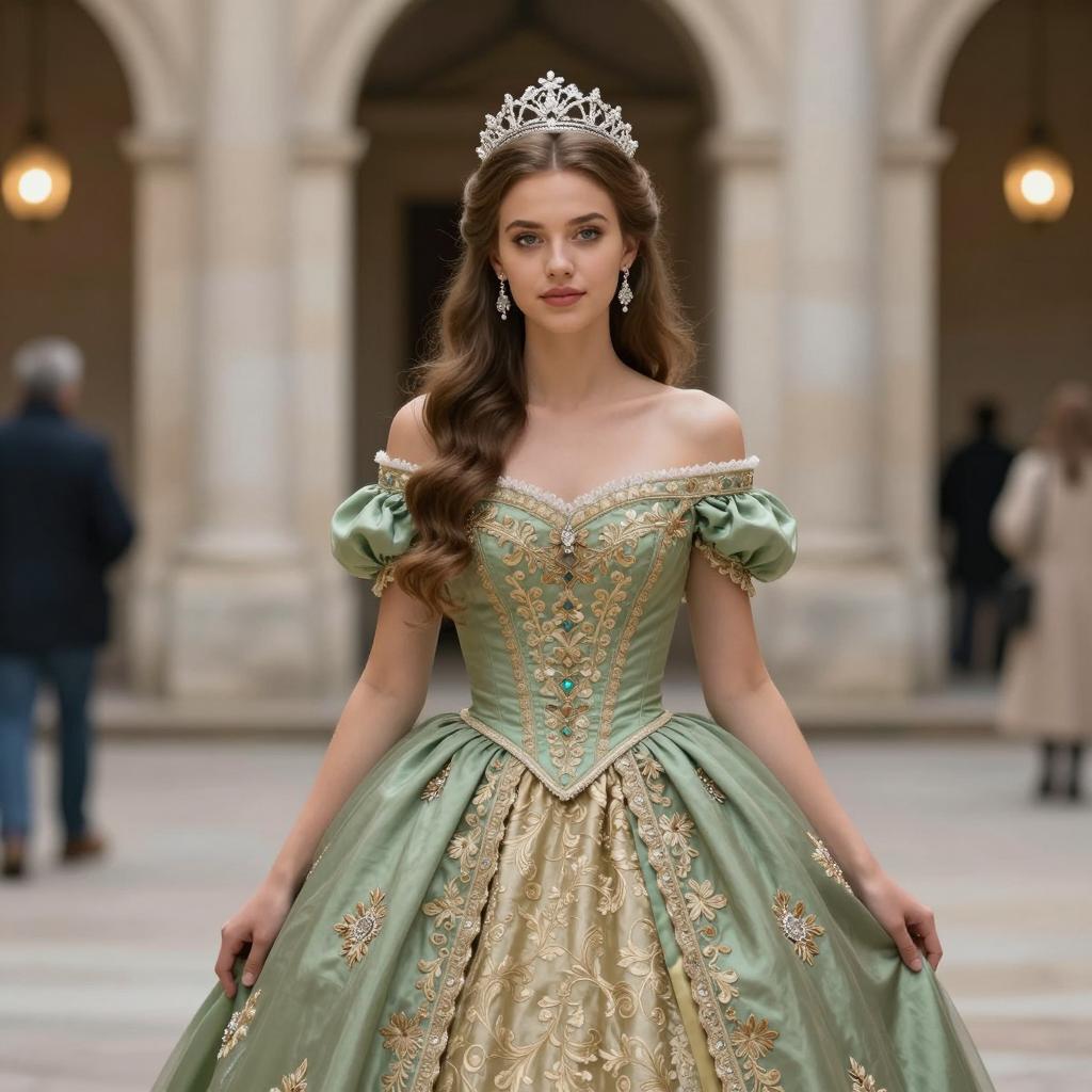 Movie quality fancy dress, photograph of a young woman standing in a vibrant garden, wearing a green, strapless dress with intricate gold embroidery on the bodice, long wavy brown hair, fair skin, natural makeup, earrings, colorful flowers in the background, sunlight, summery, clear focus on the subject, slightly blurred background, lush greenery, full-body shot, attractive, confident expression