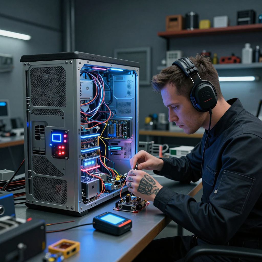 In a futuristic repair shop, a highly detailed and intricate computer PC is being meticulously repaired. The PC, a sleek, metallic behemoth with glowing blue and red lights, dominates the scene. Its transparent side panel reveals a complex network of wires, circuits, and components, hinting at advanced technology. The repairman, clad in a dark, form-fitting outfit and large headphones, is intently focused on the task at hand. His hands, adorned with tattoos, deftly manipulate tools and parts, while a small, glowing device rests on the table beside him. The surrounding environment is a blend of industrial and high-tech elements, with shelves filled with various tools and components, creating a dynamic and immersive workspace.