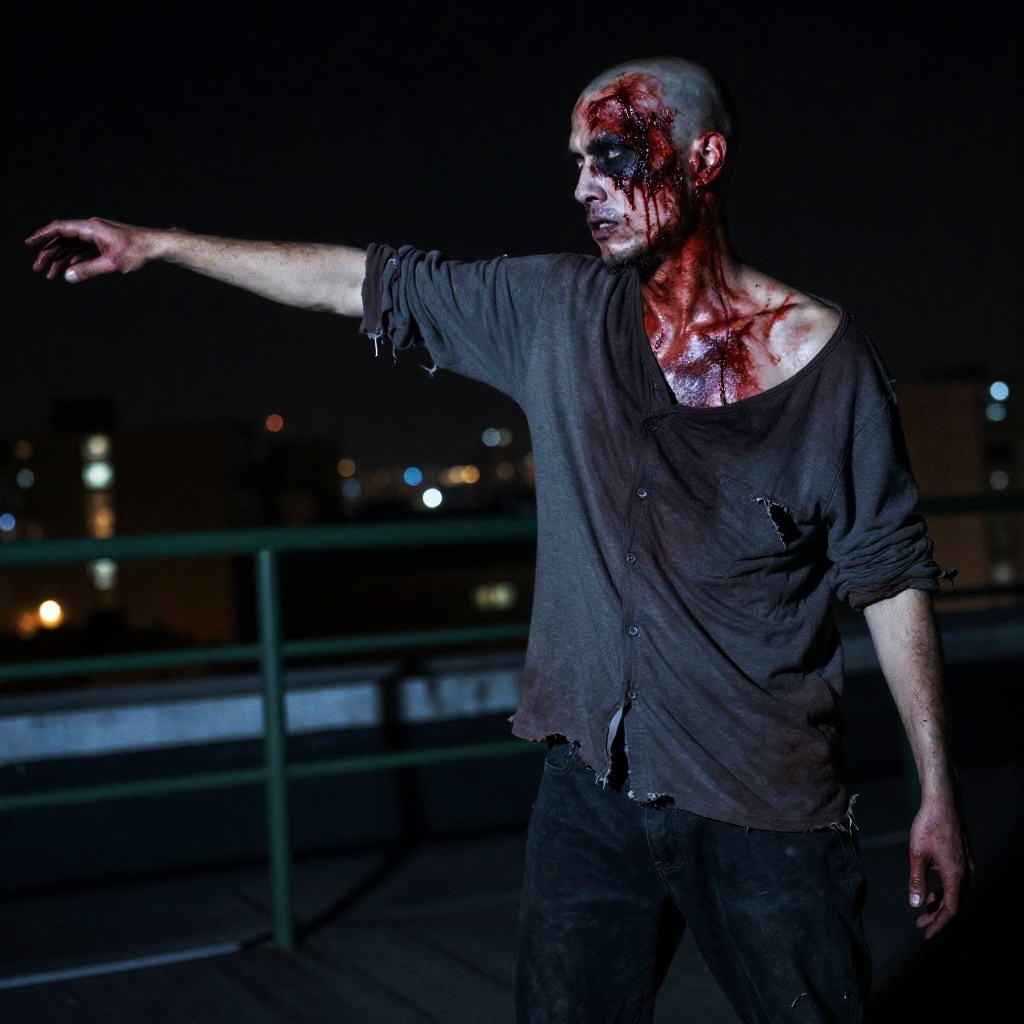 Photograph of a bald, bloody, disfigured man with a mangled face and torn clothes, standing on a dark rooftop at night. He is facing left, extending his right arm. Background features city lights and a green metal railing.