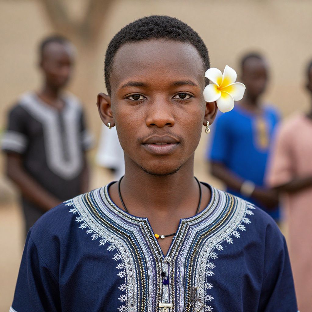 Photograph of a young Black man with short, curly hair, wearing a black shirt adorned with intricate white embroidery around the neckline. He has small, silver hoop earrings and a thin necklace. A yellow flower is digitally added to his right ear. The background is blurred but shows two other Black individuals, one in a black shirt and another in a blue shirt, standing outdoors with a beige wall and tree in the distance. The man's expression is neutral, and the focus is on his face and shirt.