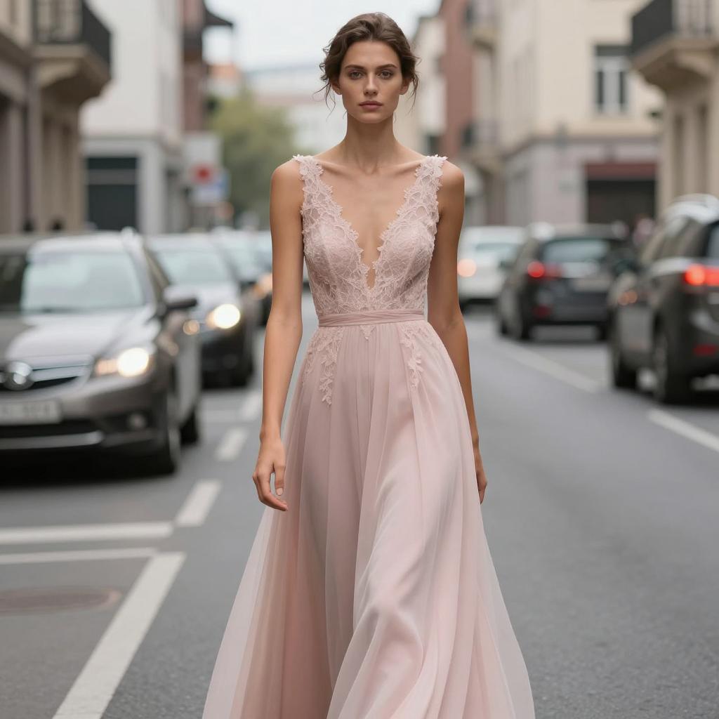 Western gowns party, photograph of a beautiful woman, standing on a sunlit street, wearing a pink, sleeveless, floor-length gown with intricate floral embroidery on the bodice, holding out the sides of her dress, wavy brown hair, fair skin, confident expression, background of blurred buildings and trees, warm afternoon light, elegant and graceful, fashion photography style, bokeh effect in background, soft and romantic atmosphere