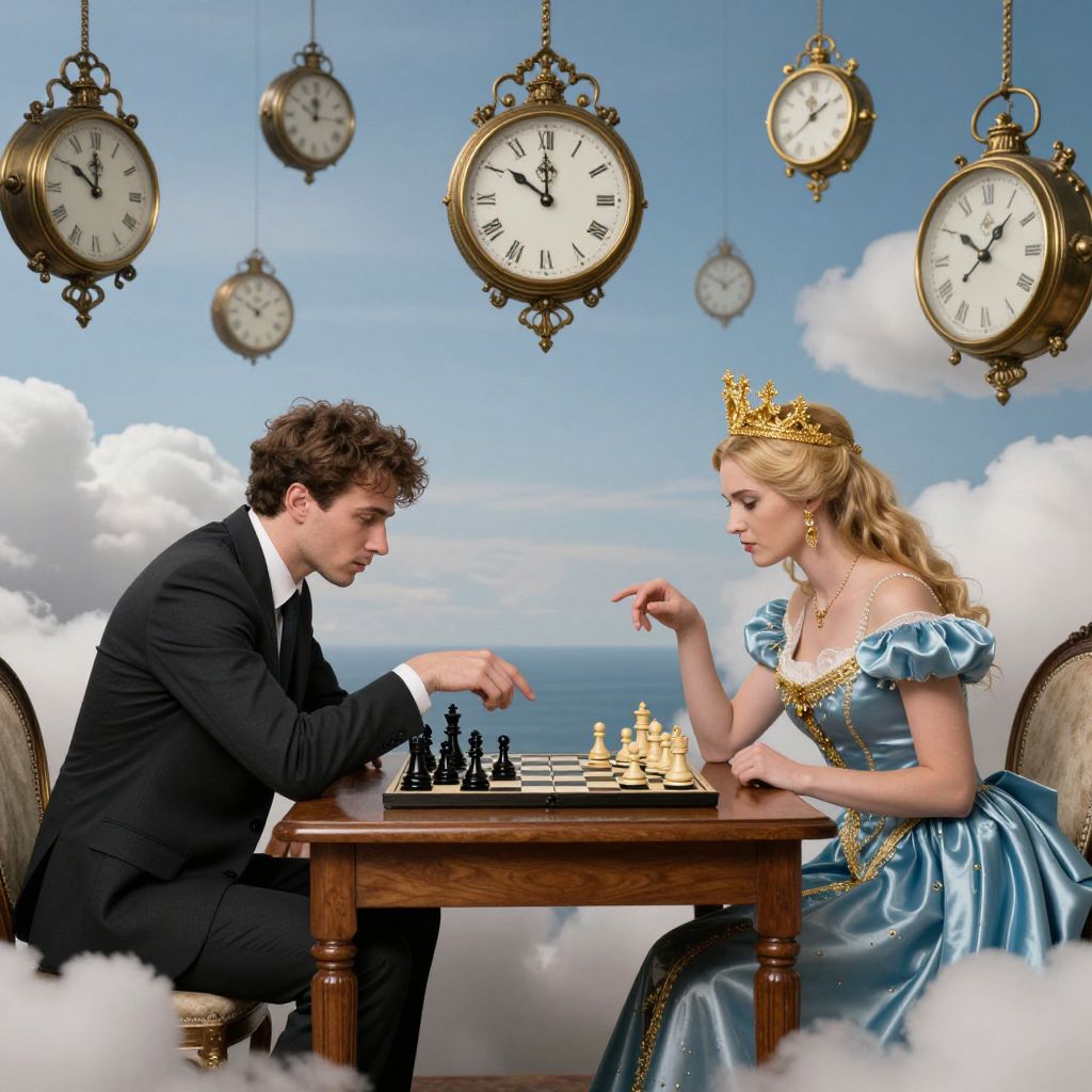 Photograph-like digital artwork depicting a fairytale scene. A blonde, fair-skinned princess with a gold crown and blue, satin, off-the-shoulder gown sits across from a dark-haired, fair-skinned man in a black suit. They face each other over a chessboard on a wooden table, surrounded by floating, vintage-style clocks against a sky-blue background with fluffy clouds. The princess points at a chess piece, while the man looks intently at the board. The setting is surreal, blending reality with fantasy, emphasizing a timeless, romantic atmosphere.