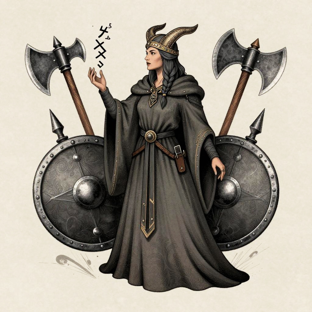 Viking witch tattoo concept showing a Nordic witch in a flowing cloak with braided hair, casting magical runes into the air, encircled by Viking shields and axes, designed with detailed black line work and subtle color highlights to emphasize mysticism.