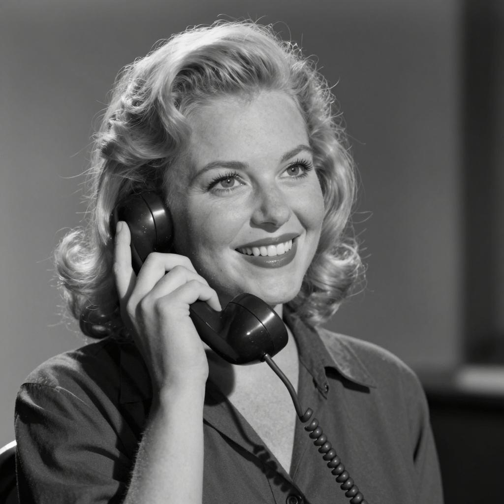 Black and white photograph of a smiling woman with wavy blonde hair, holding a vintage telephone receiver to her ear. She wears a dark top, and the background is blurred. She has a bright, toothy smile. She is positioned in the center of the frame, facing slightly to the right.