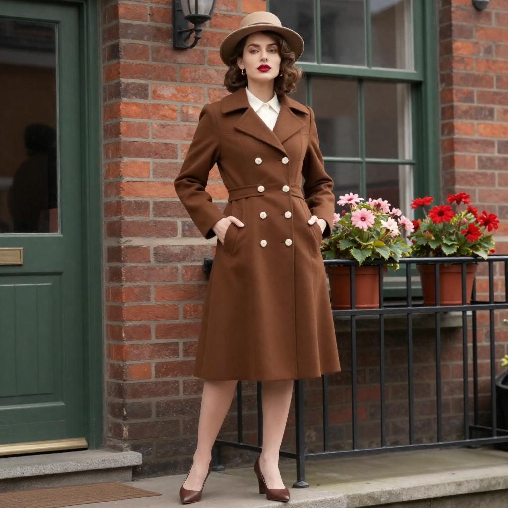 Woman in vintage brown coat with white buttons, standing on balcony. Floral backdrop, red pots with flowers, green window frames. Brick building, door on left. She wears hat, heels, confident pose. Red lips, neutral expression.