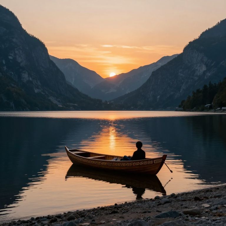 A breathtaking vista captures an idyllic mountain lake bathed in the warm hues of a setting sun, with majestic peaks framing the tranquil scene. A solitary figure rests along the shoreline, their silhouette mirrored on the calm waters as they gently rock a handcrafted wooden vessel adorned with intricate carvings reminiscent of indigenous artistry. This evocative tableau encapsulates a moment of serene contemplation and deep connection to nature's beauty, inviting viewers to share in the solitude and introspection depicted within its carefully composed frame.