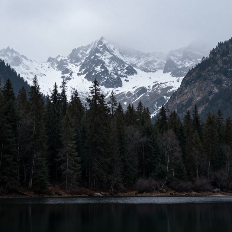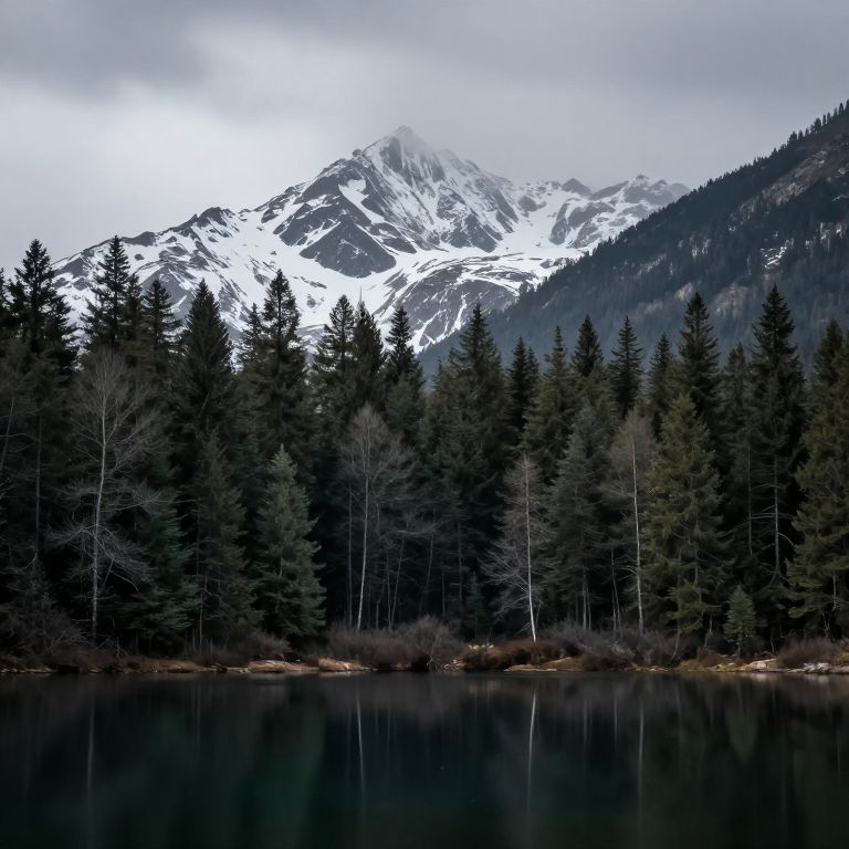 Photograph of a serene mountain landscape featuring a dense forest of dark green evergreen trees in the foreground, reflecting on a calm, mirror-like lake. The mid-ground shows the forest transitioning into a rocky, snow-capped mountain peak with jagged edges and patches of white snow under a cloudy, overcast sky. The colors are predominantly dark greens, whites, and grays, with subtle brown hues from the forest floor and rocky mountain base. The image captures a tranquil, untouched natural scene with a sense of depth and majesty.