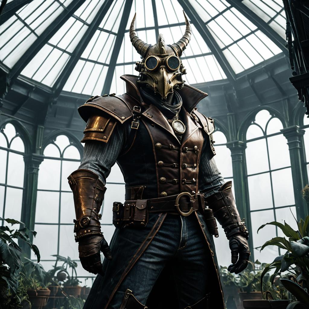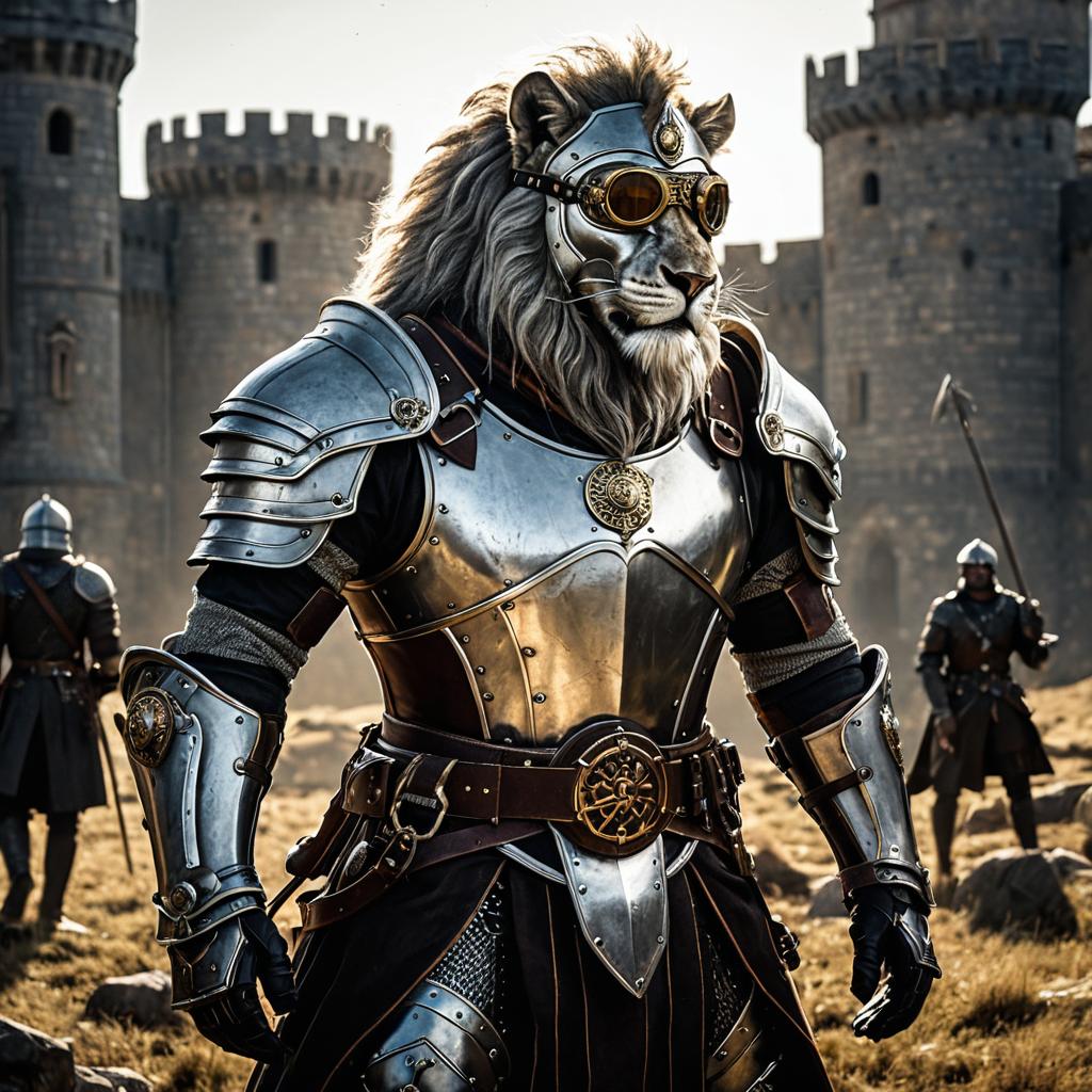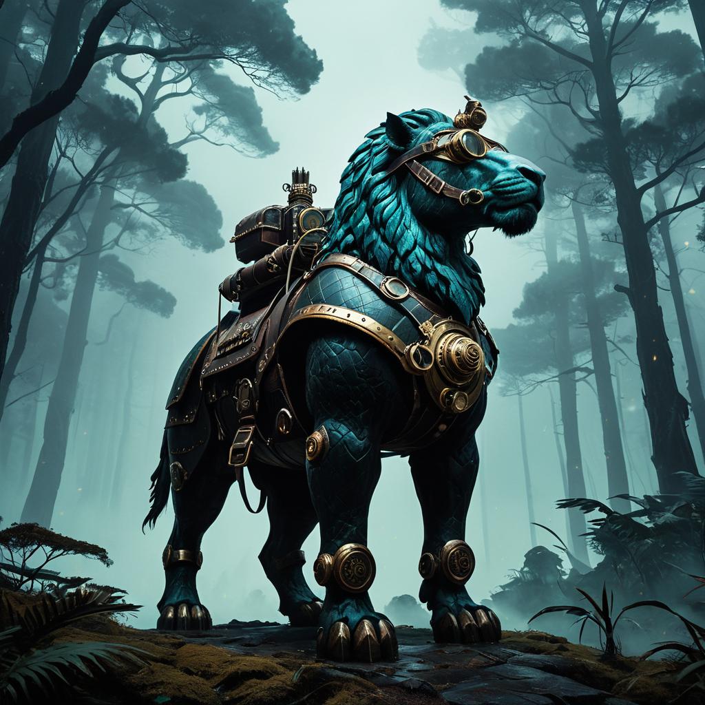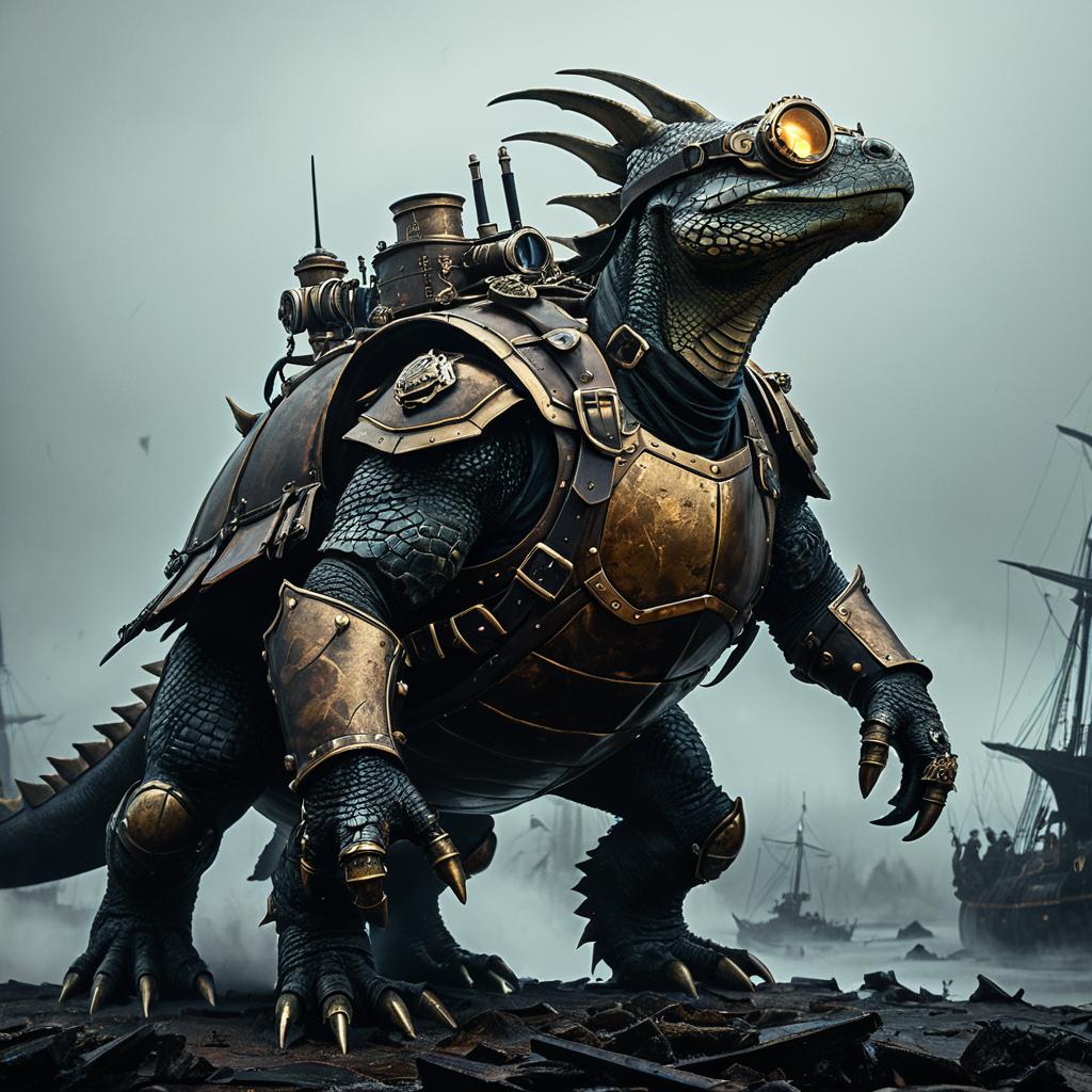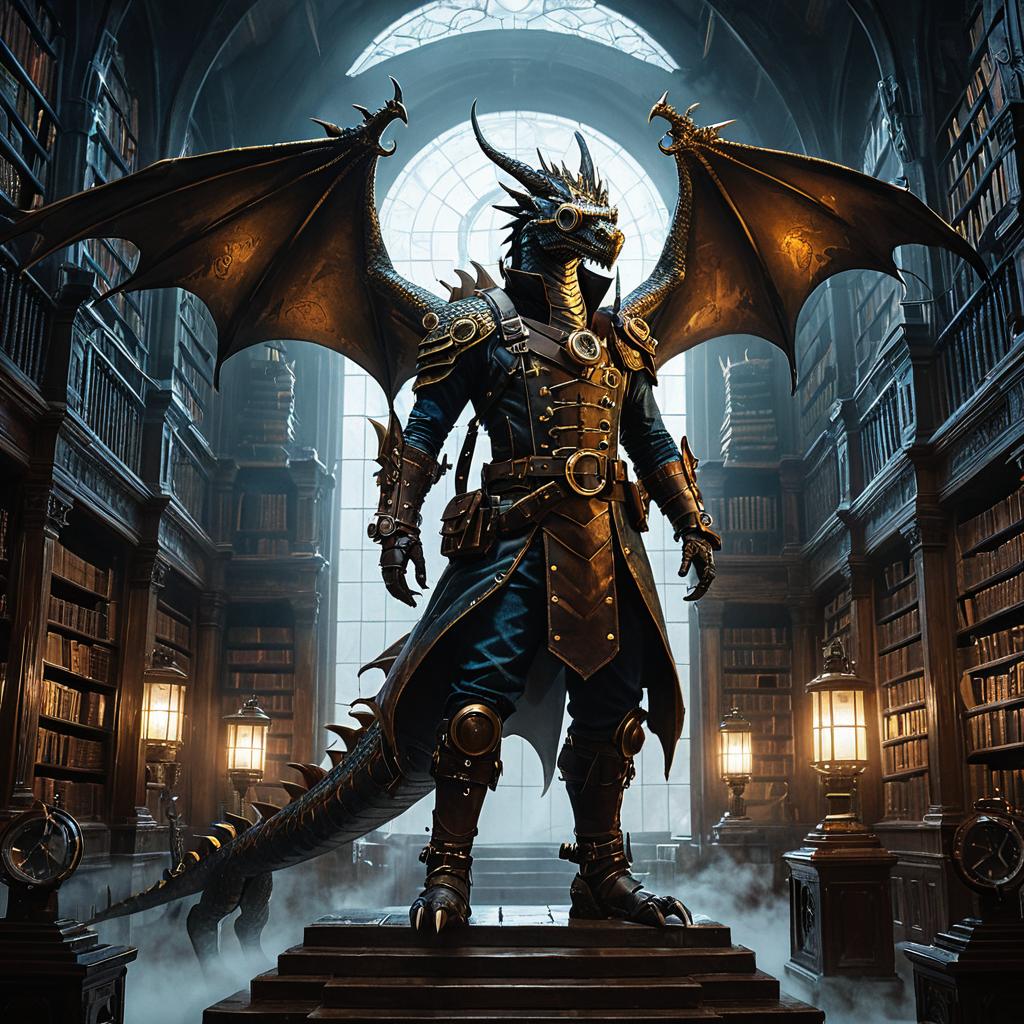A majestic anthropomorphic bronze dragonborn clad in detailed leather harness armor with steampunk elements, including goggles and mechanical accessories, stands confidently atop a fog-covered ancient stone lighthouse. The scene features cinematic chiaroscuro lighting with a moody, atmospheric background. Digital painting and concept art style with sharp focus and matte finish.