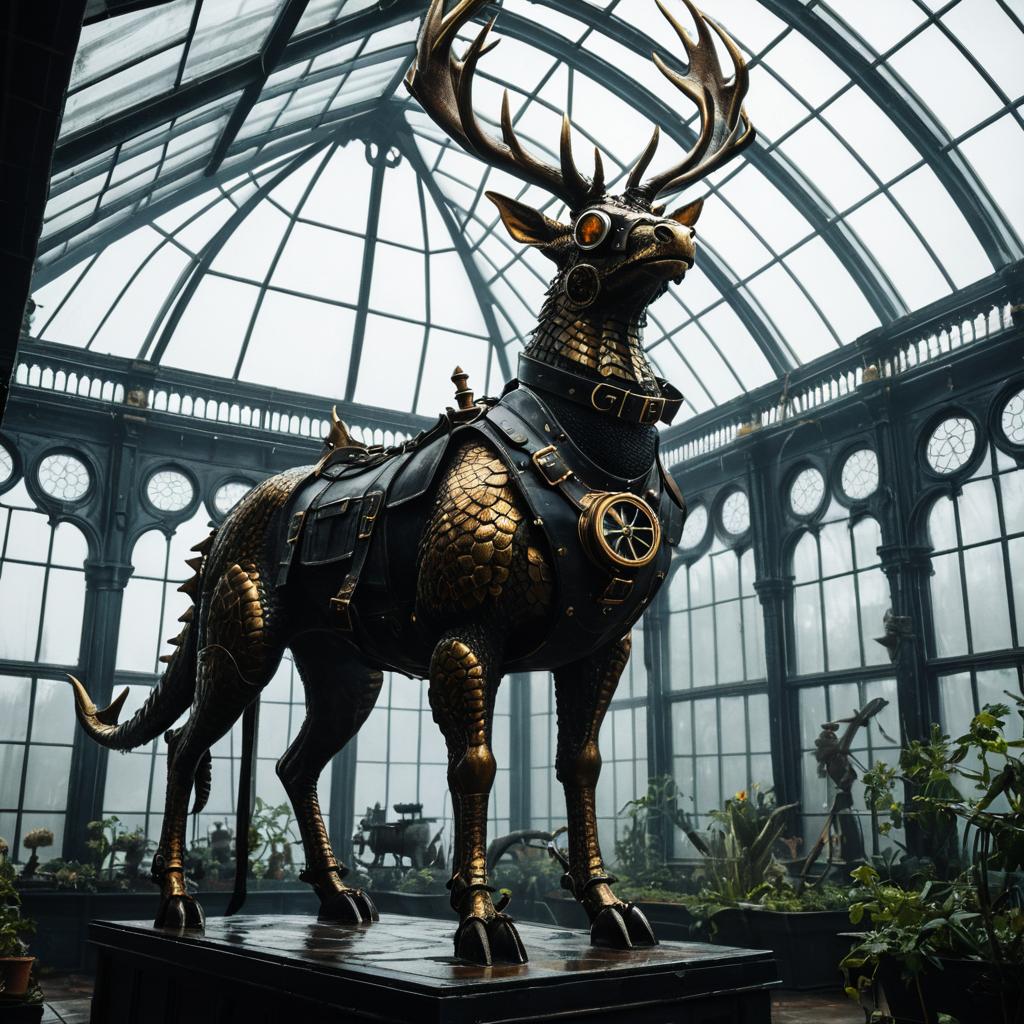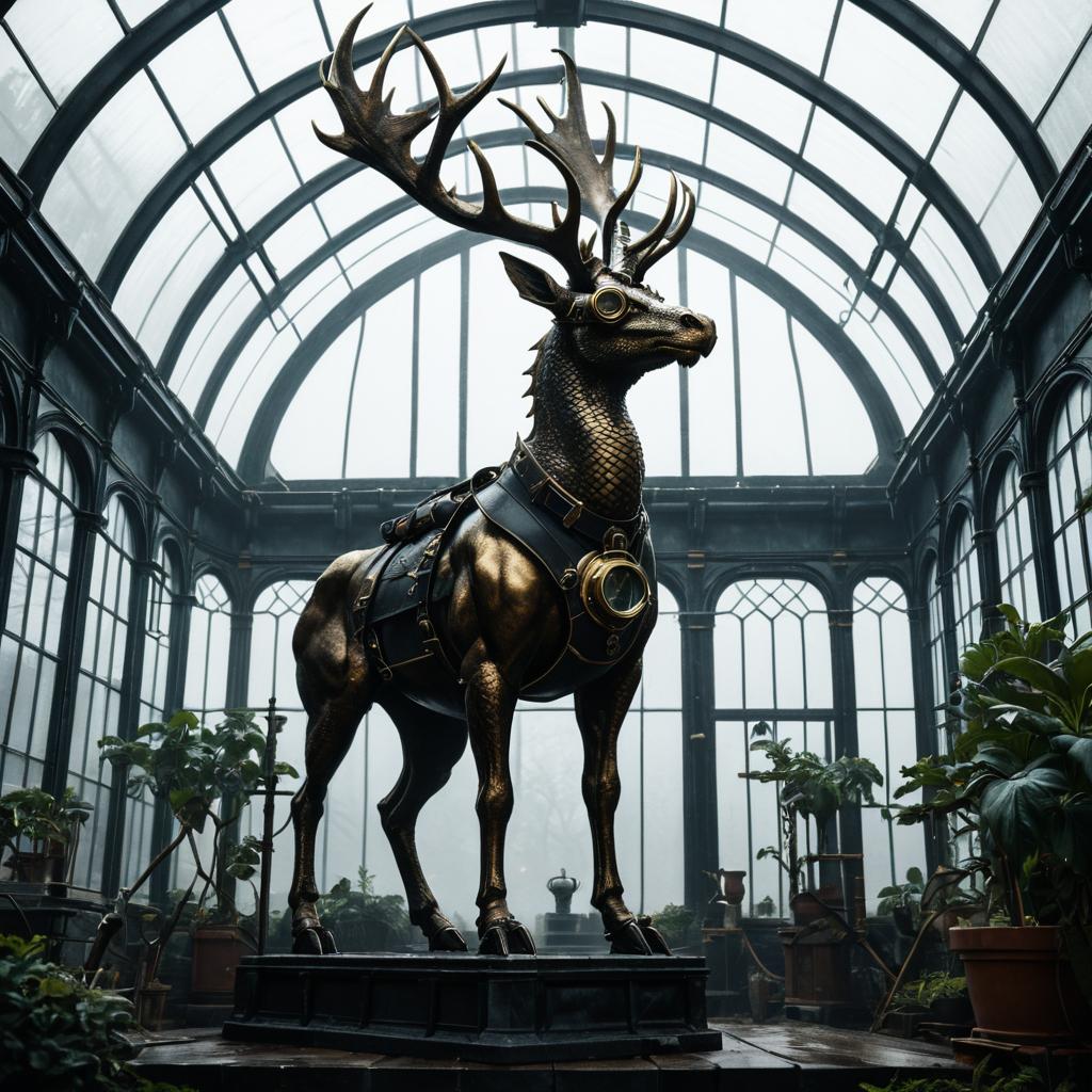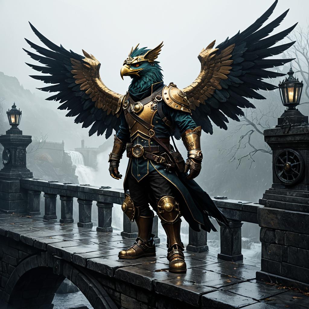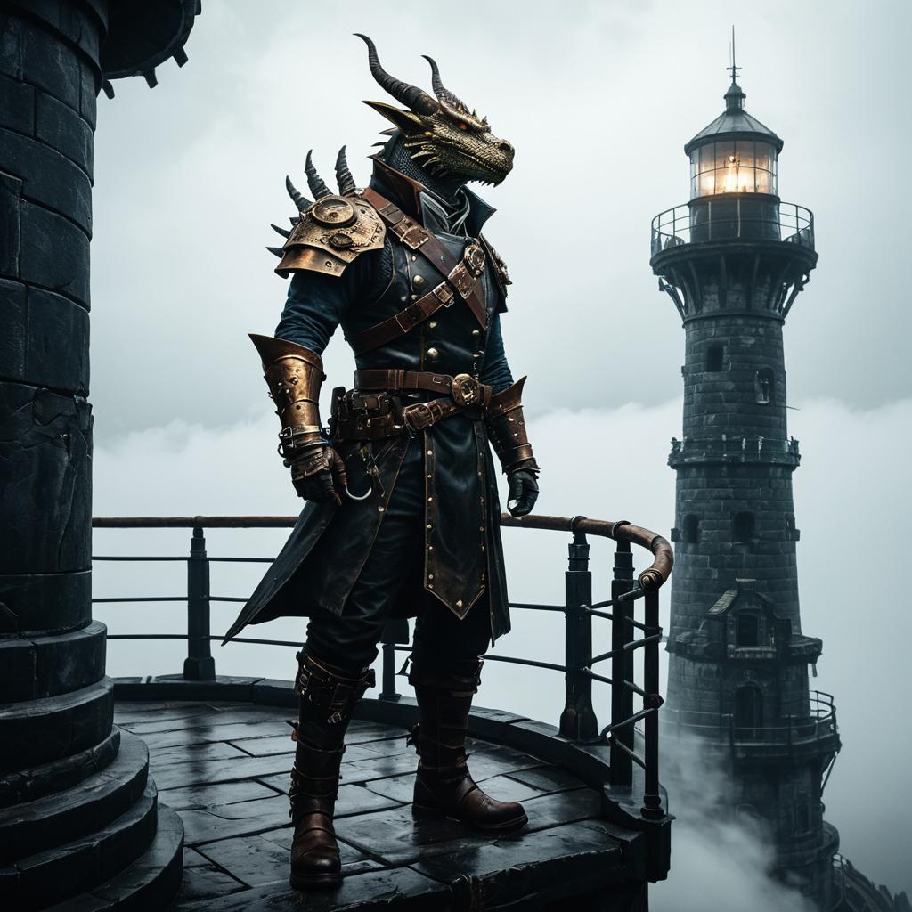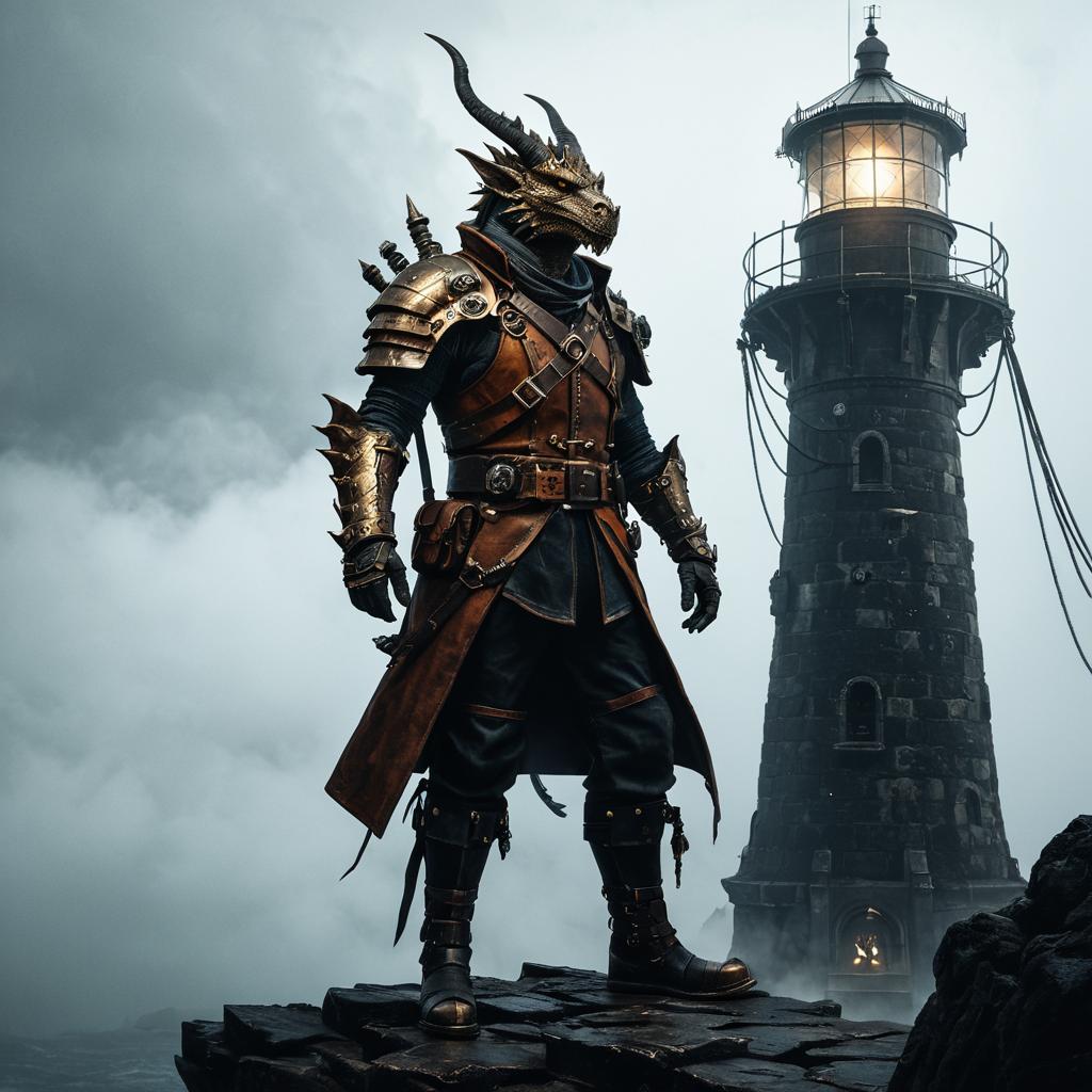 Anthropomorphic Bronze Dragonborn Warrior at Foggy Lighthouse