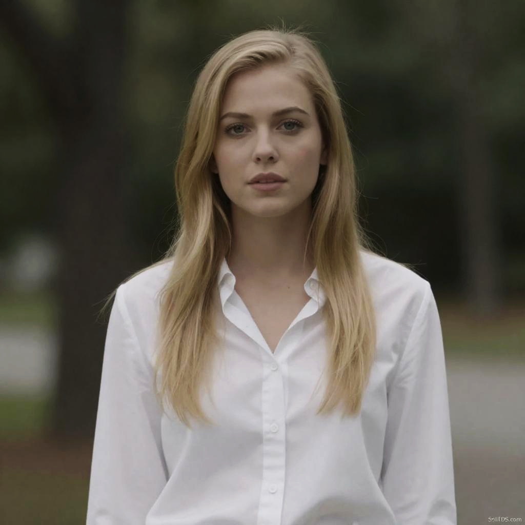 Photograph of a blonde woman with wavy hair, leaning over a man with short brown hair, both on a dark surface. Woman's intense gaze, man's face partially visible, wearing white dress. Background is blurred. Text "MovieStillDB.com" in bottom right.