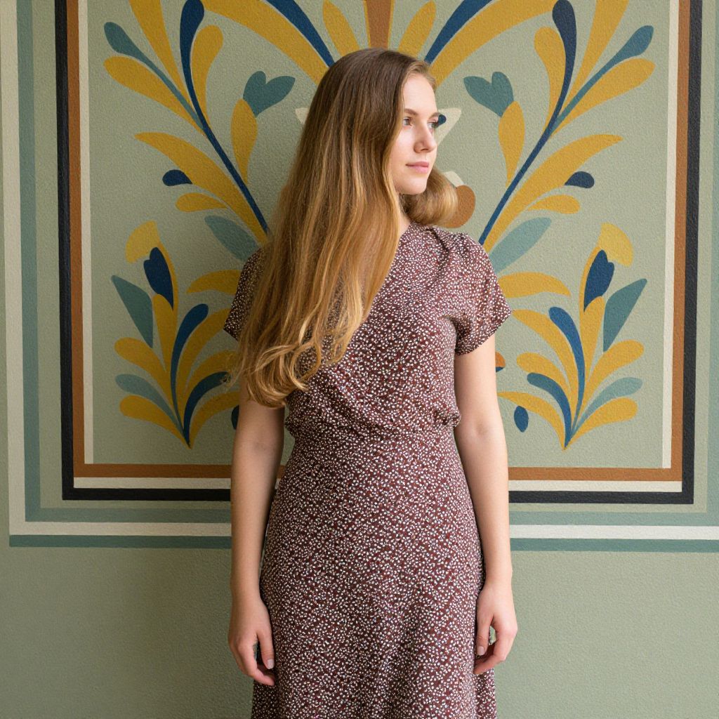 A young woman with long blonde hair wearing a brown dress with a red and white floral pattern stands in front of a textured wall featuring an intricate design with mustard yellow and blue leaf-like shapes. The natural soft lighting highlights her contemplative expression and the harmony between her dress and the decorative background, creating an elegant, serene atmosphere.
