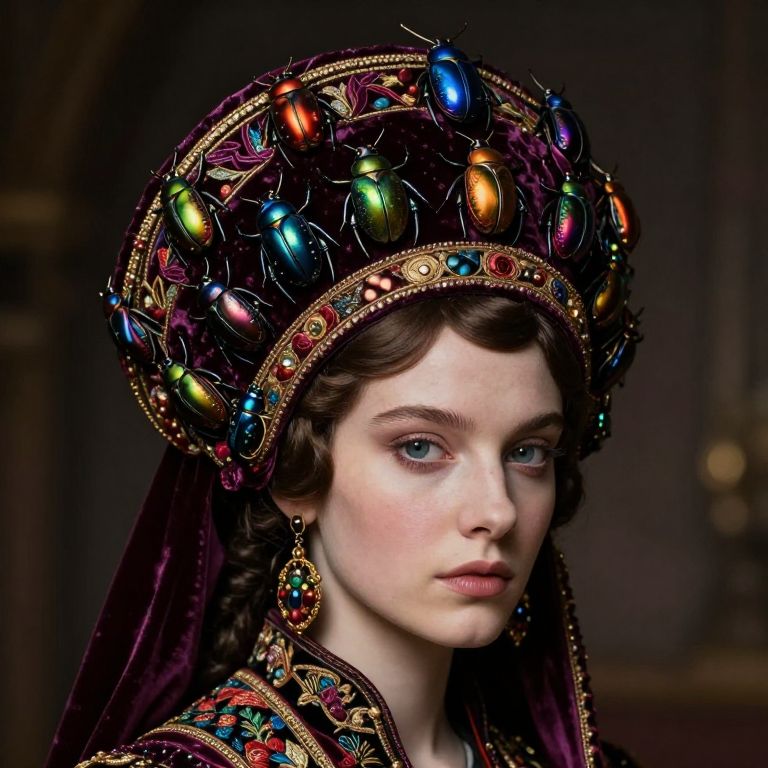 A digitally created, hyper-realistic portrait of a pale-skinned woman with blue eyes, wearing an elaborate, colorful headdress adorned with glowing, multicolored beads and intricate gold detailing. She has dark brown, wavy hair partially covered by a deep purple veil. Her attire matches the headdress with similar colorful beads and gold accents. She wears large, matching earrings. The background is dark and blurred, highlighting the subject's detailed and vibrant costume. The image has a fantasy, Victorian-inspired aesthetic.