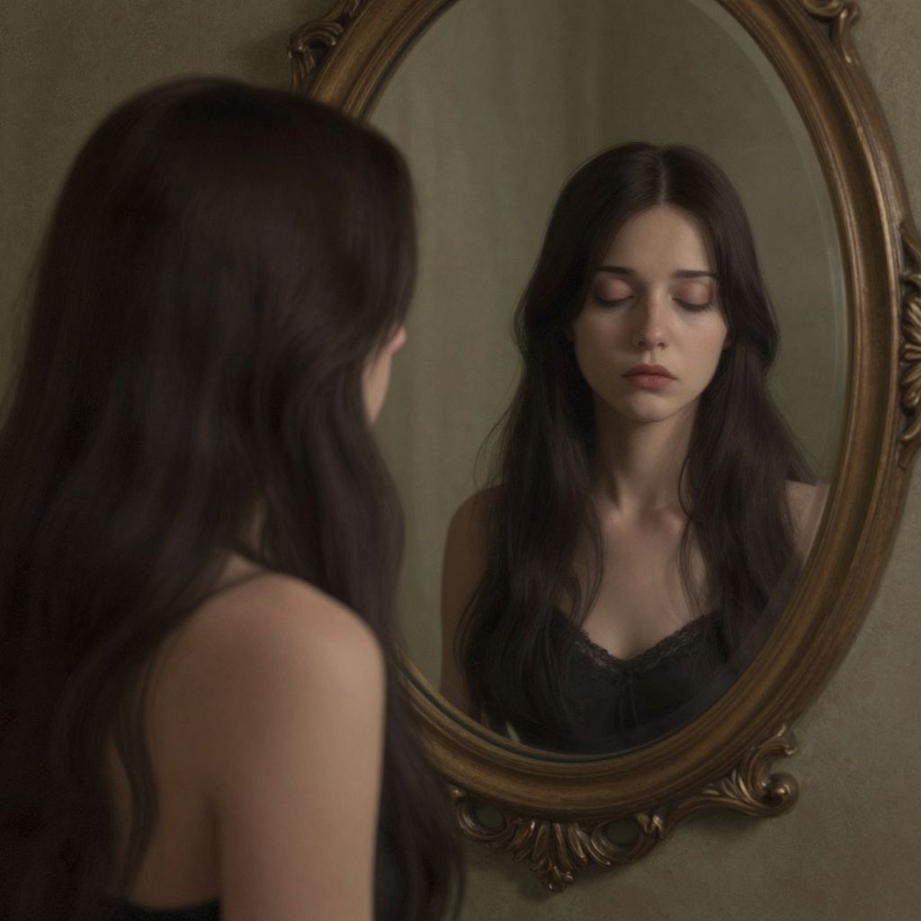 A hauntingly realistic digital artwork captures a somber moment as a woman with long, dark hair gazes into a mirror, her reflection revealing a melancholic doppelgänger with closed eyes, set against a vintage, textured backdrop that evokes a timeless, introspective atmosphere.
