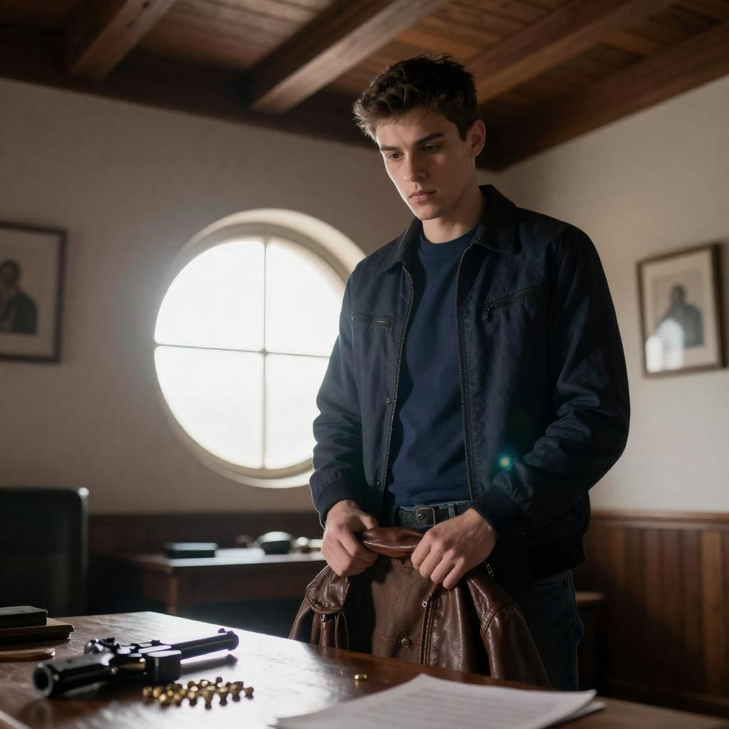 Photograph of a man with short, spiked brown hair, intense expression, holding a glowing orange flame close to his face. He wears a dark shirt. Background shows a dimly lit, rustic interior with a metal-framed window. Two people visible in the background, out of focus.