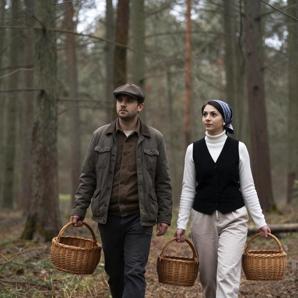 Photograph of a man and woman walking through a dense forest. Man wears a brown flat cap, jacket, and holds a basket. Woman wears a headscarf, white turtleneck, black vest, and light pants, also holds a basket. Both look ahead. Tall, bare trees in background. Overcast lighting. Man on left, woman on right.