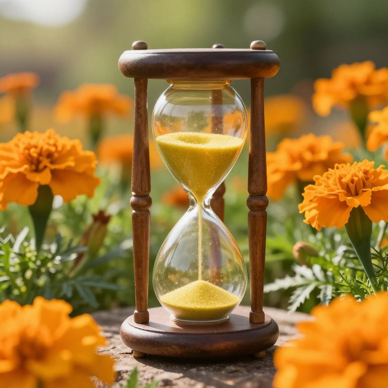 A vintage hourglass stands gracefully amidst a vibrant garden of orange marigolds, its golden sand flowing steadily as sunlight filters through the blossoms, symbolizing the passage of time against a serene natural backdrop.