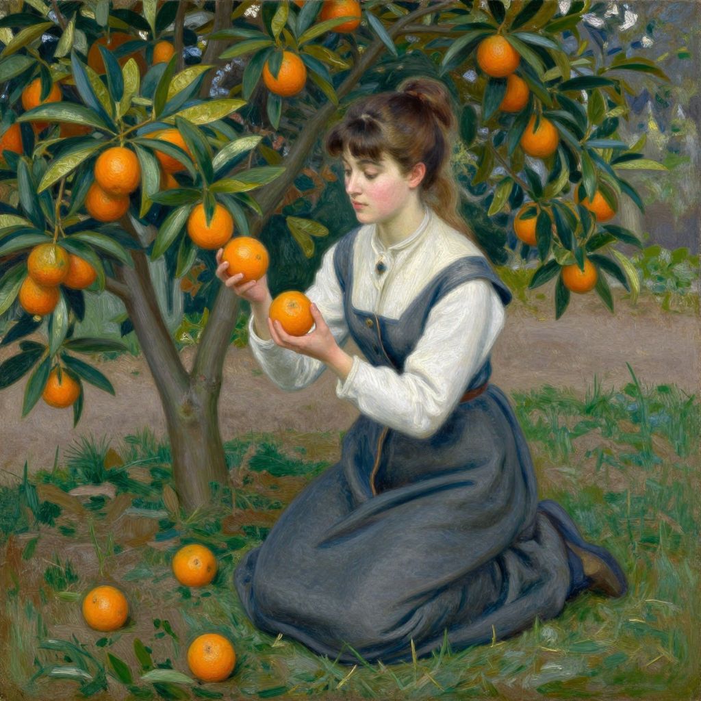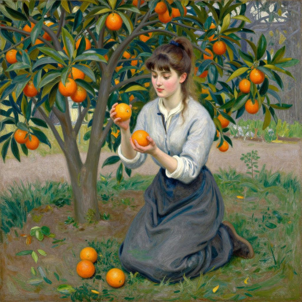 Berthe Morisot's 1889 oil painting depicts a young woman in a serene garden, kneeling amidst vibrant orange fruit trees, delicately holding two ripe oranges while surrounded by others scattered on the grassy ground.