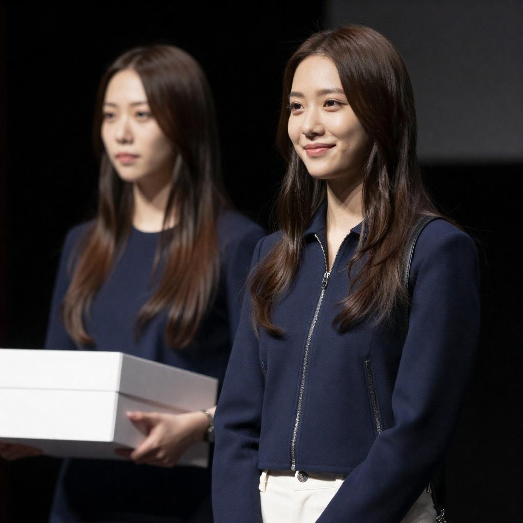 Photograph of two women with long, wavy hair. The woman in the foreground wears a navy blue jacket and white pants, smiling softly, with a small black purse on her shoulder. The woman in the background, in a dark blue top, holds a bright white box, looking slightly away. Dark, plain background.