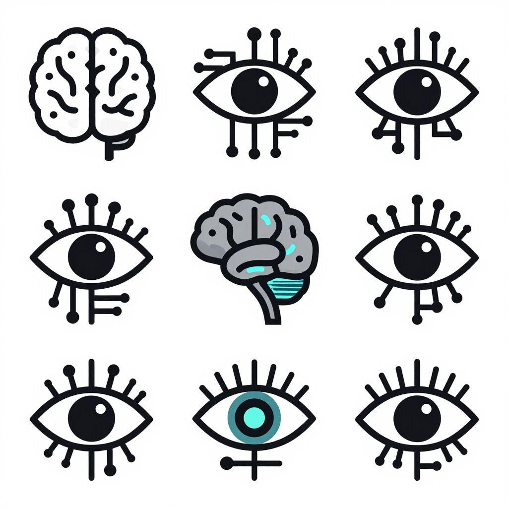 Clip art ai set including symbolic representations of artificial intelligence such as brain circuits and digital eyes, minimal and clean vector illustrations with monochrome and neon highlights, ideal for modern educational and business designs