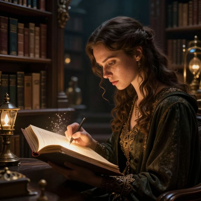 Photograph of a young woman with long, wavy brown hair and fair skin, dressed in a dark, ornate medieval-style gown, reading an open book illuminated by a glowing lantern. She's seated at a wooden table in a dimly lit library filled with bookshelves. She holds a quill pen in her right hand, with sparkles of ink visible. The background is blurred, highlighting the warm, soft light from the lantern and the detailed textures of her gown and the book. The overall mood is mystical and scholarly, with a focus on the intimate, focused moment of reading.