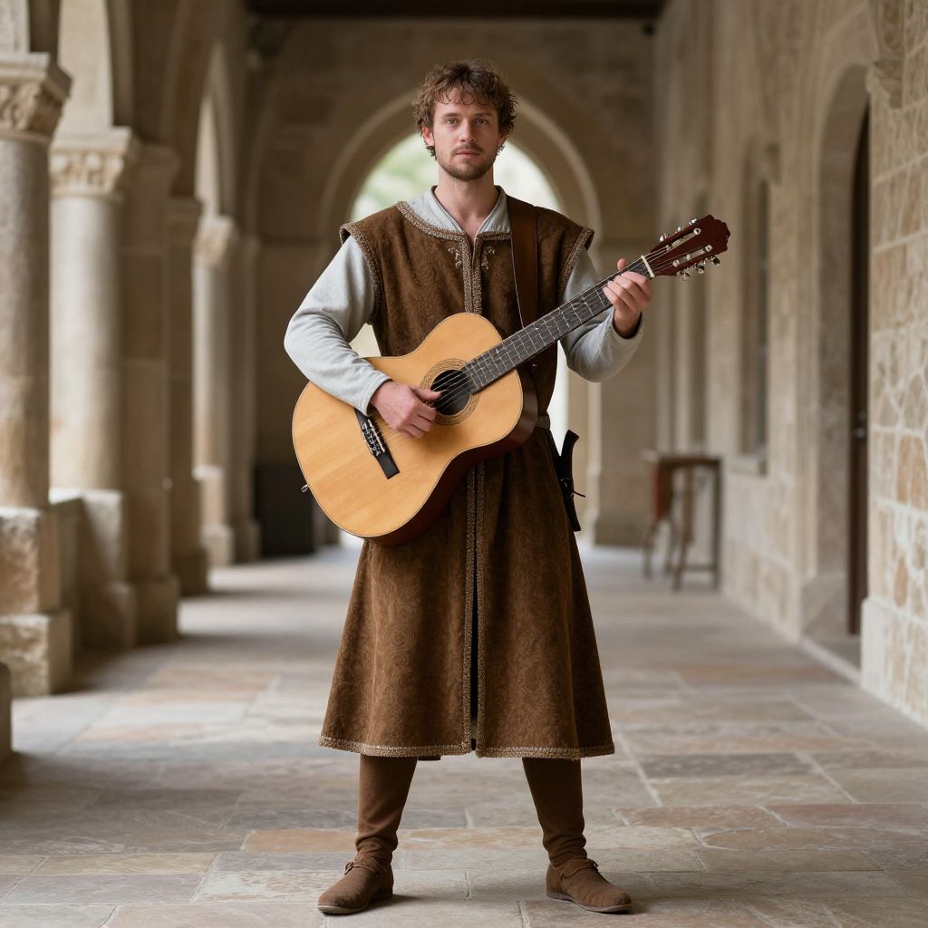 Medieval bard attire, man in medieval costume holding a guitar in a hallway