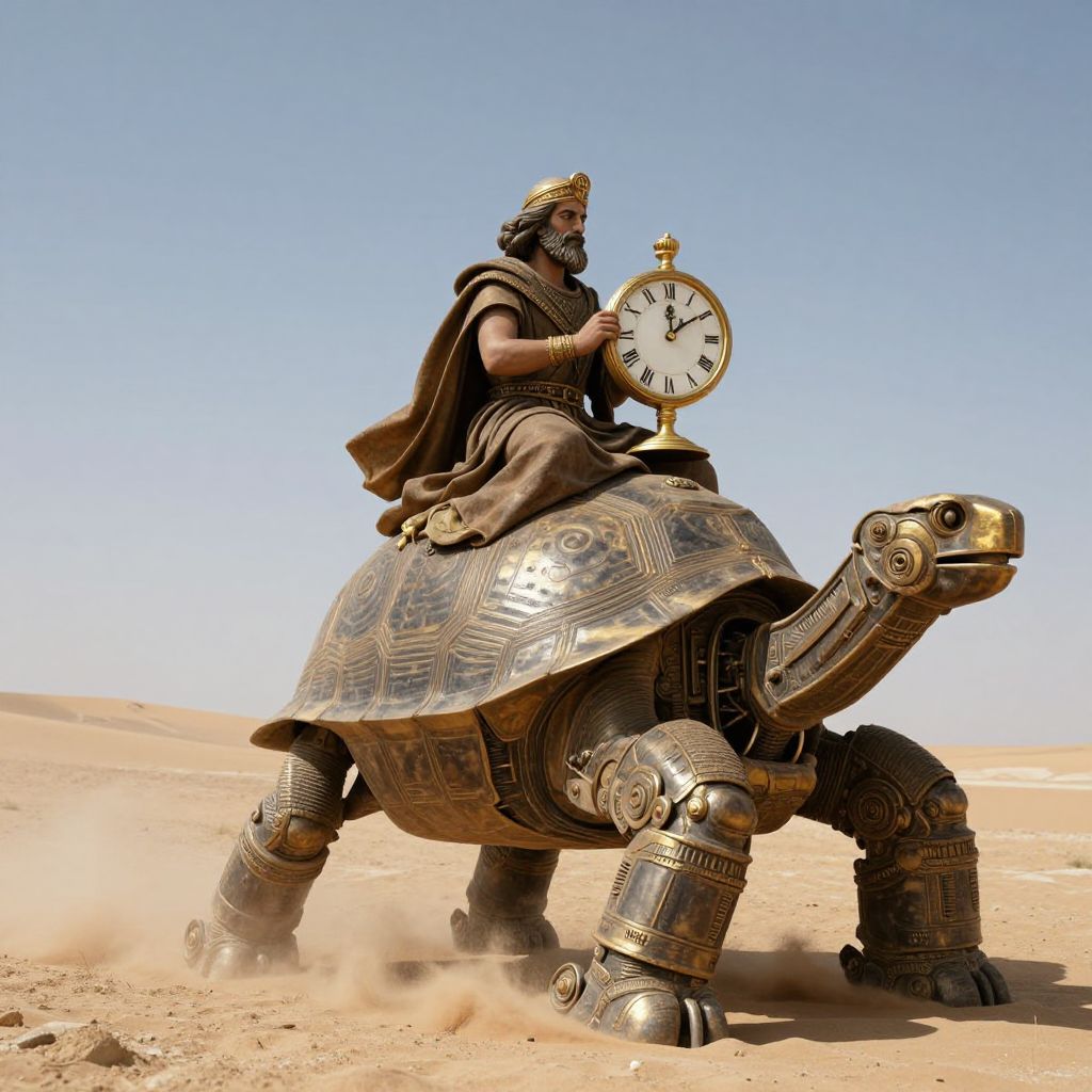 Ancient philosopher rides atop a massive mechanical tortoise, gripping a golden clock with Roman numerals that ticks backward, as sand billows beneath its powerful strides across a desolate desert landscape.
