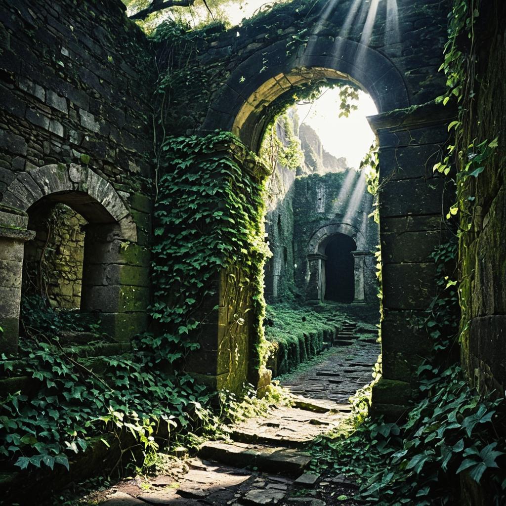 Sunbeams Through Ivy-Covered Ancient Ruins