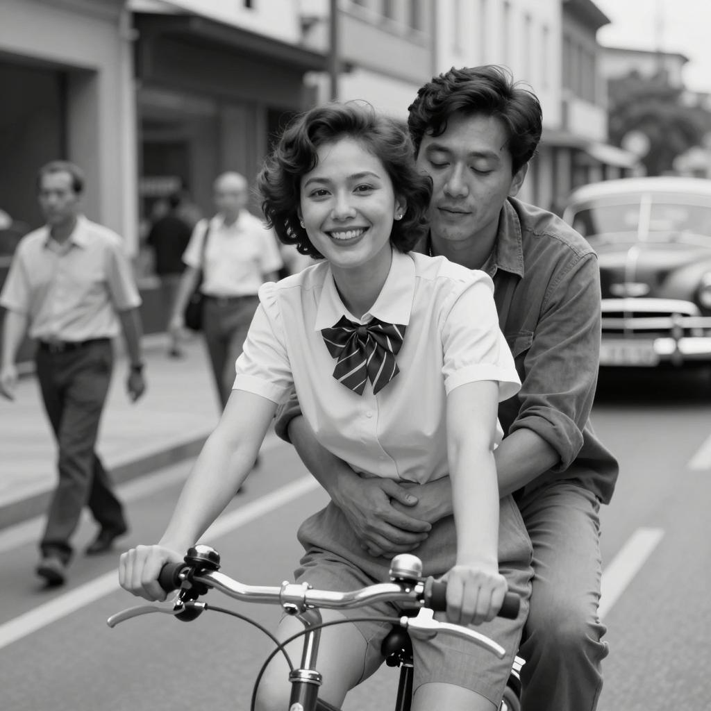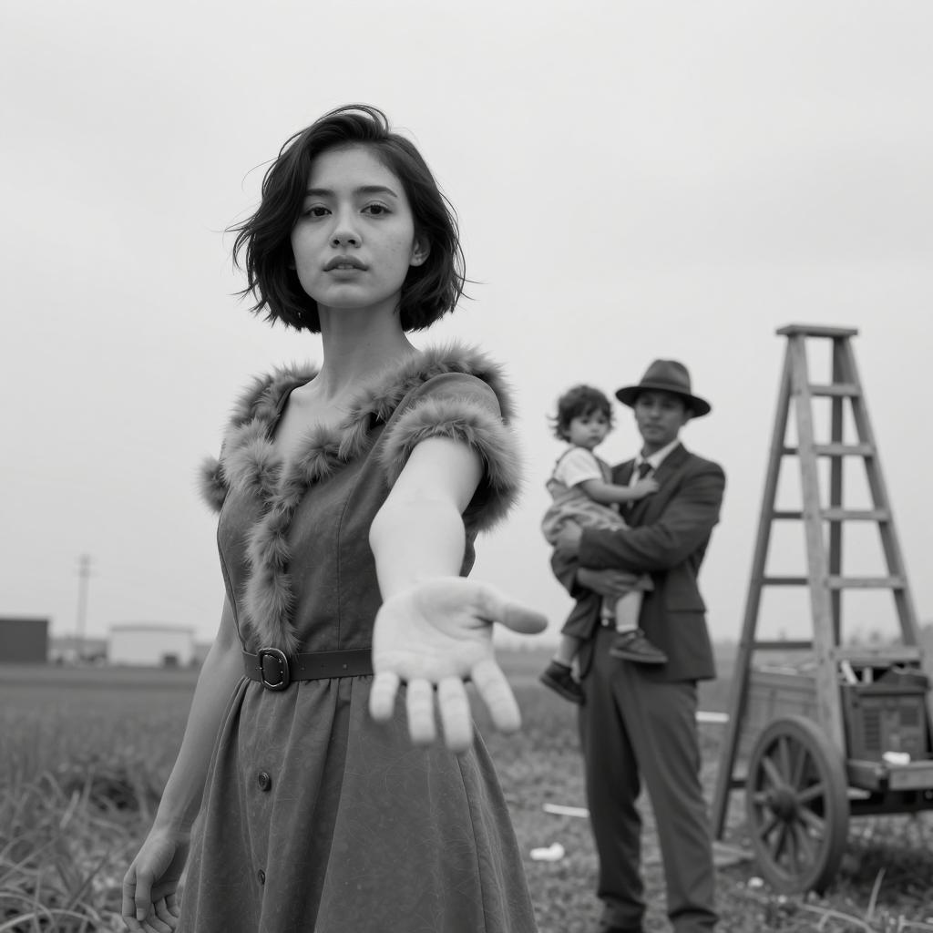 Black and white photograph. Female lead in foreground with short dark hair, wearing a fur-trimmed dress, reaching out with an open hand. Male in background with hat and suit, holding a child. Wooden ladder and cart on the right. Overcast sky.