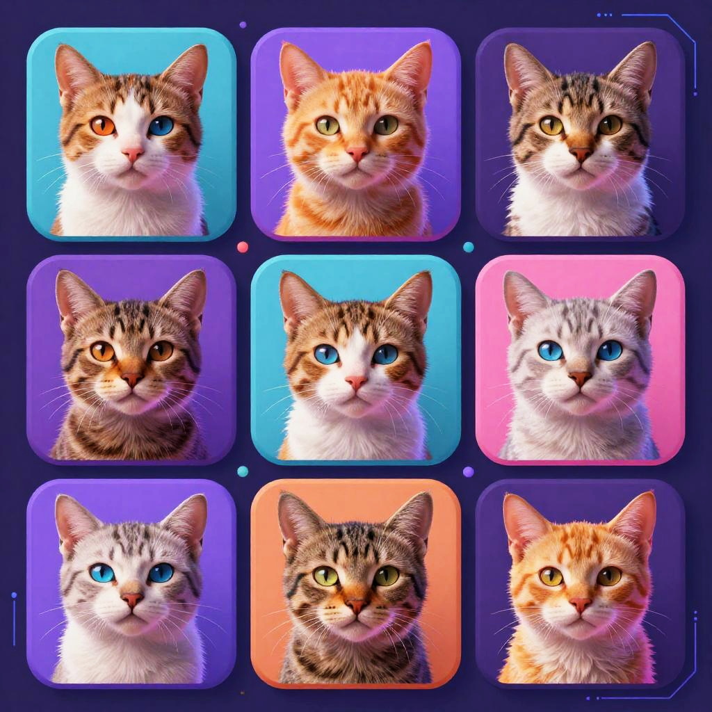 AI cat image generator producing a variety of whimsical, colorful feline portraits, featuring diverse breeds and imaginative backgrounds, digital art style with vibrant neon accents and sharp details, futuristic interface elements blending seamlessly into the scene.