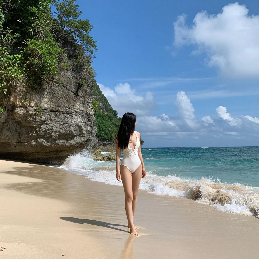 A serene beach scene rendered in a hyper-realistic digital art style, featuring a woman in a white swimsuit standing on the shore, with waves gently crashing against the sand and a rocky cliff adorned with lush greenery under a vibrant blue sky dotted with fluffy clouds.