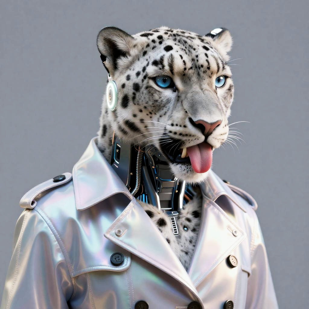 A stunningly realistic digital artwork depicting a cybernetic snow leopard sporting neon LED ear cuff and a reflective iridescent trench coat. Its tongue is playfully sticking out, and this ultra-detailed piece boasts a 4K resolution, currently trending on various art platforms, showcasing exquisite details and a cutting-edge aesthetic.