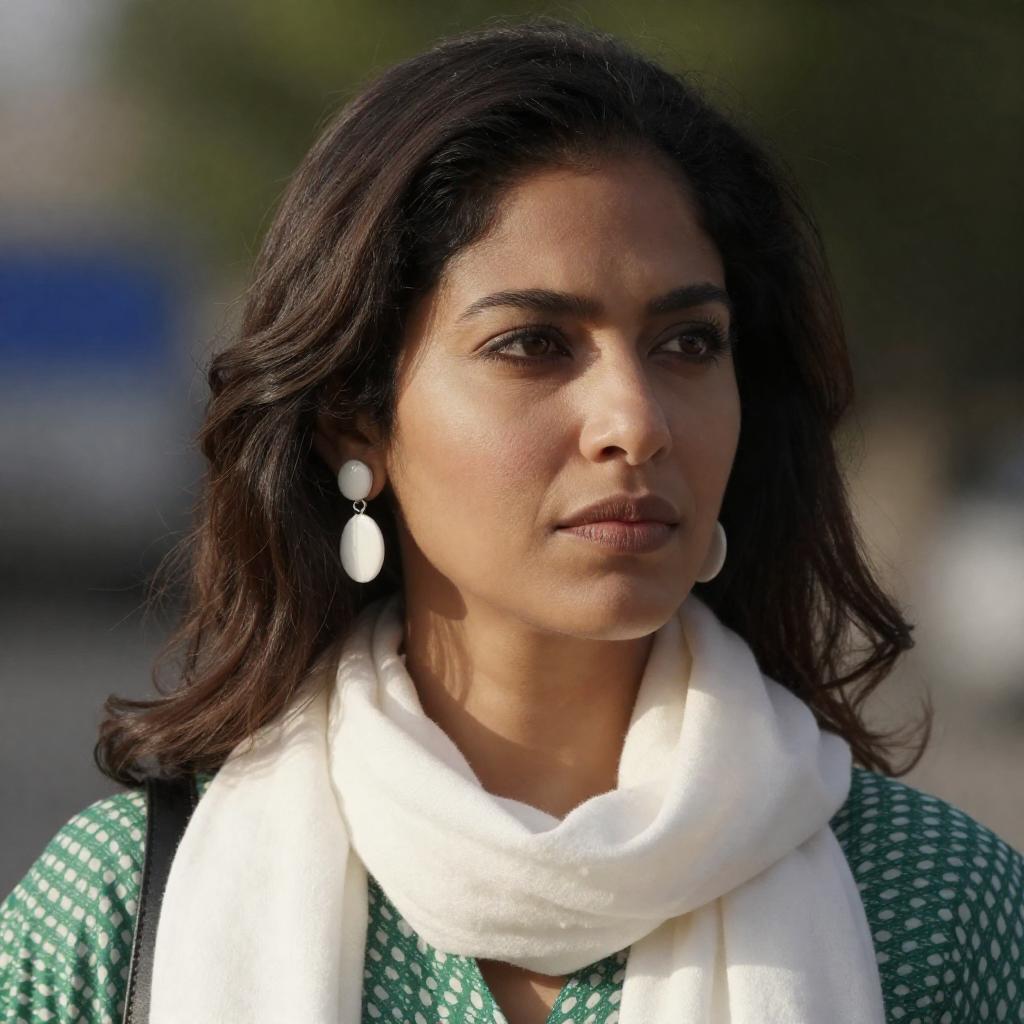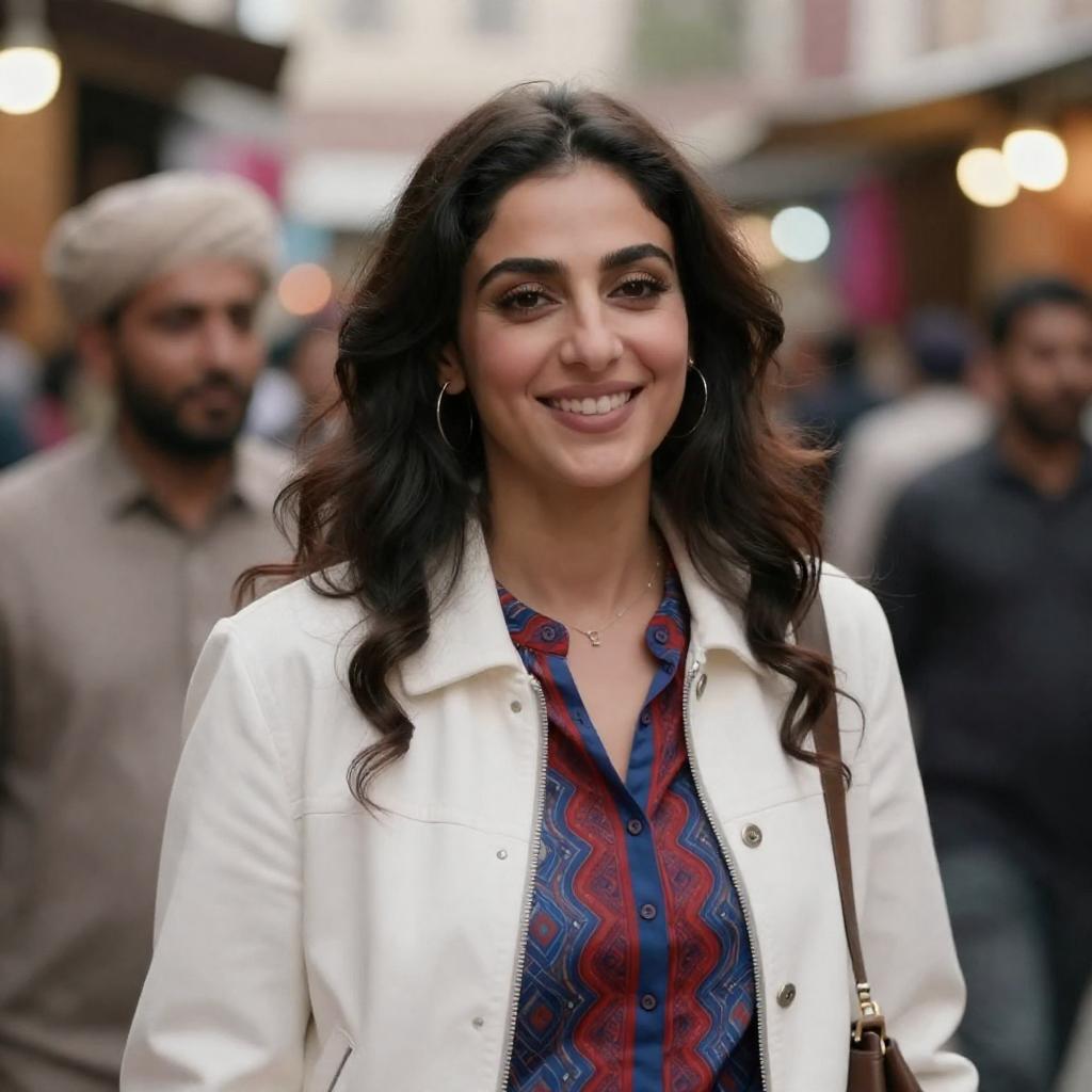 Photograph of a smiling woman with dark, voluminous hair wearing a white jacket with red and blue patterned shirt underneath. She stands in a bustling, warmly lit outdoor market, with blurred people and colorful lights in the background. A man with a beige turban is partially visible to her left.