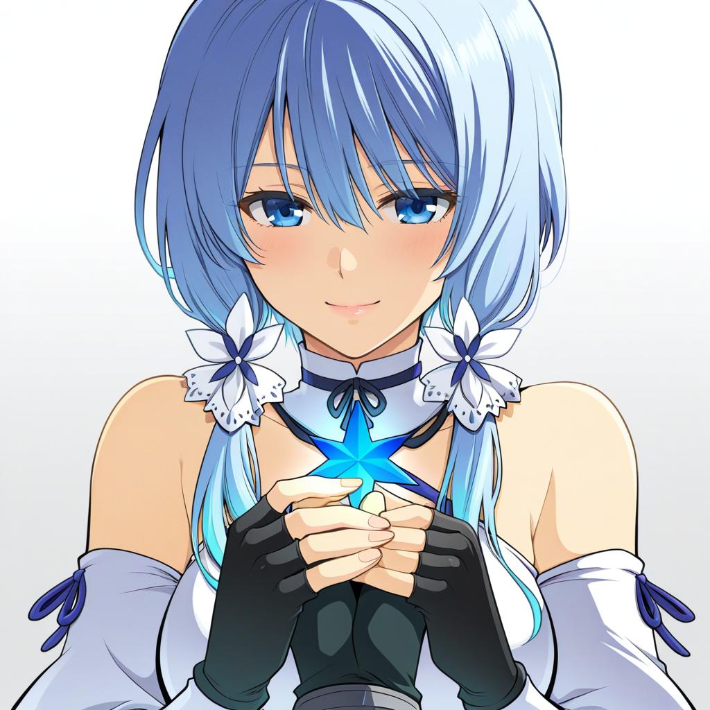 Aqua (kingdom hearts), kingdom hearts, 1girl, blue eyes, hair between eyes, blue hair, short hair, medium breasts, fingerless gloves, bare shoulders, detached sleeves, by artist suetake (kinrui), illustrious