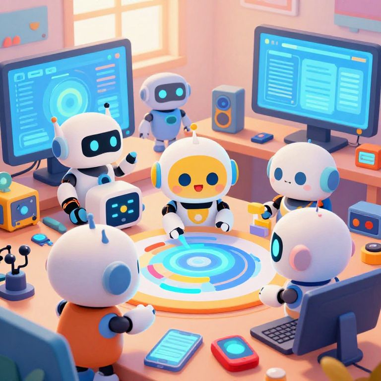 AI generator cartoon illustration showing a group of cute AI robots collaborating on a creative project in a vibrant workspace filled with digital screens and gadgets, exaggerated cartoon features with lively colors, dynamic composition with a sense of teamwork and innovation