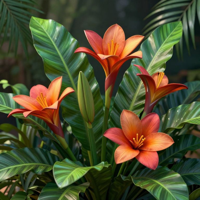 A hyper-detailed C4D render of tropical flowers and foliage, featuring vibrant colors, sharp focus, and atmospheric lighting effects.